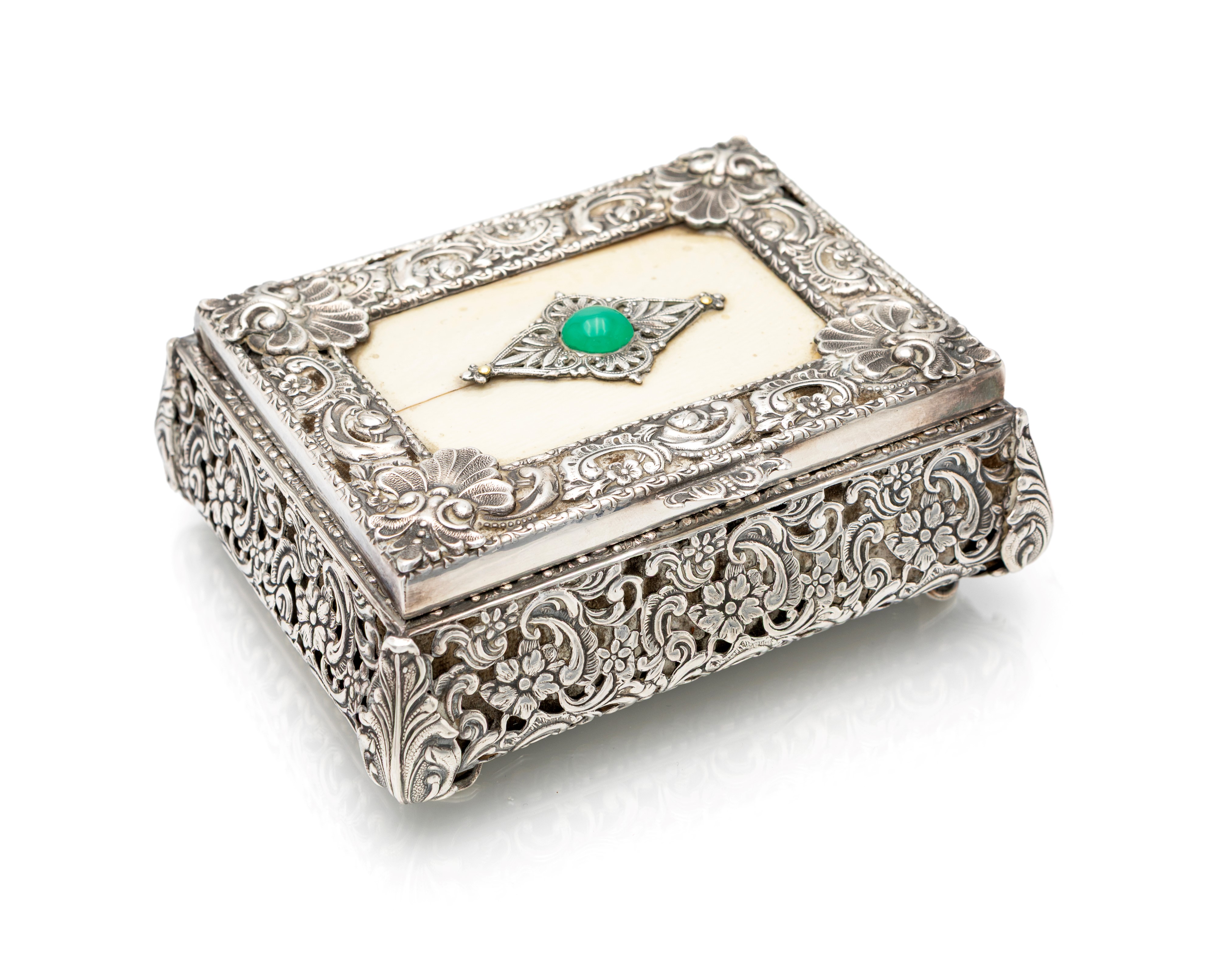 cofanetto rettangolare rivestito in argento interamente cesellato a motivi vegetali e fiori; sul coperchio una gemma verde cabochon; piedi incurvati con attacco angolare forma di foglia lanceolata