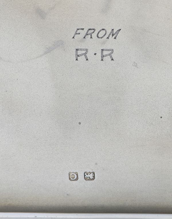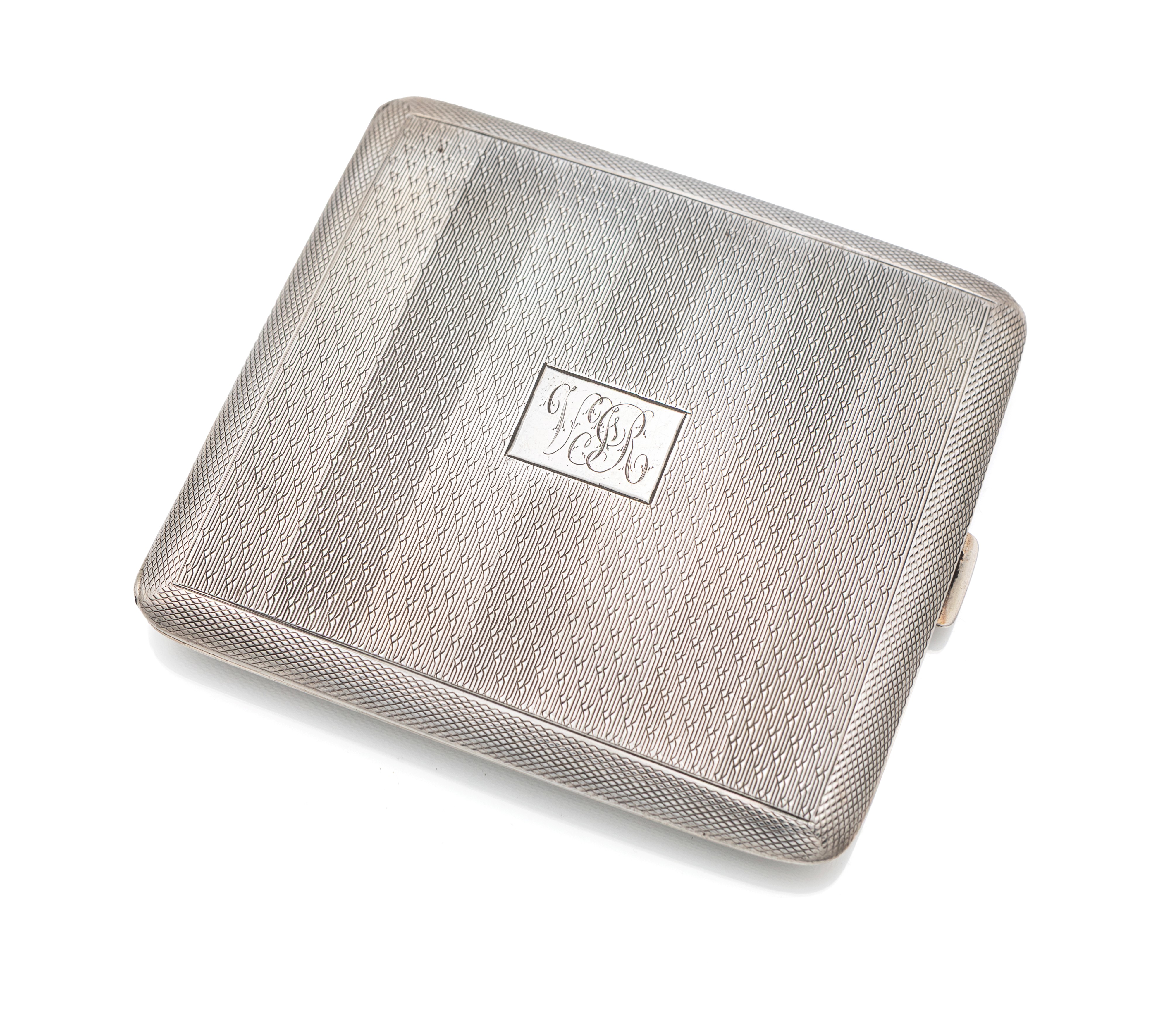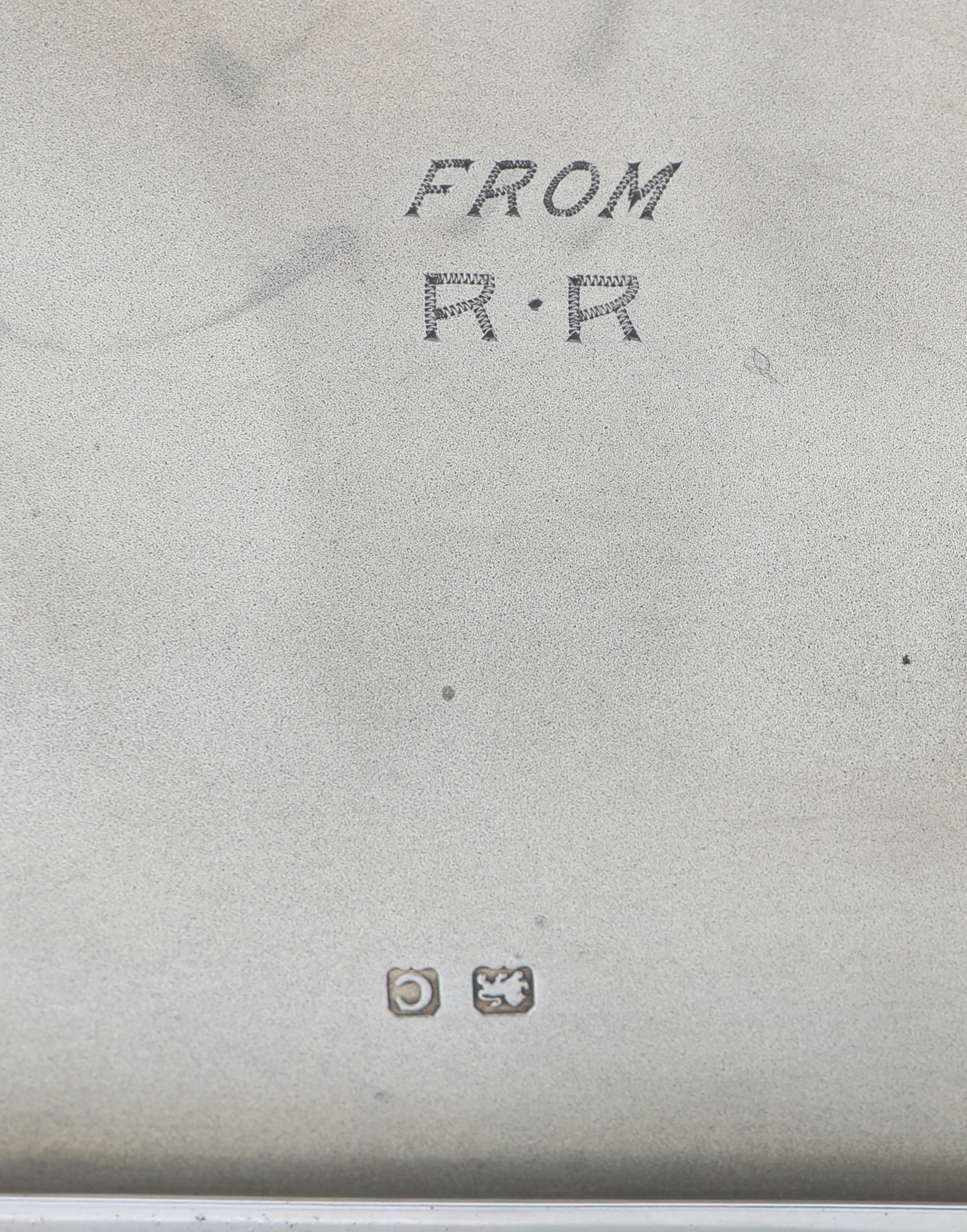 superficie percorsa da piccoli motivi trilobati su fondo rigato; profili a grana di riso. Sul coperchio tabella con iniziali incise