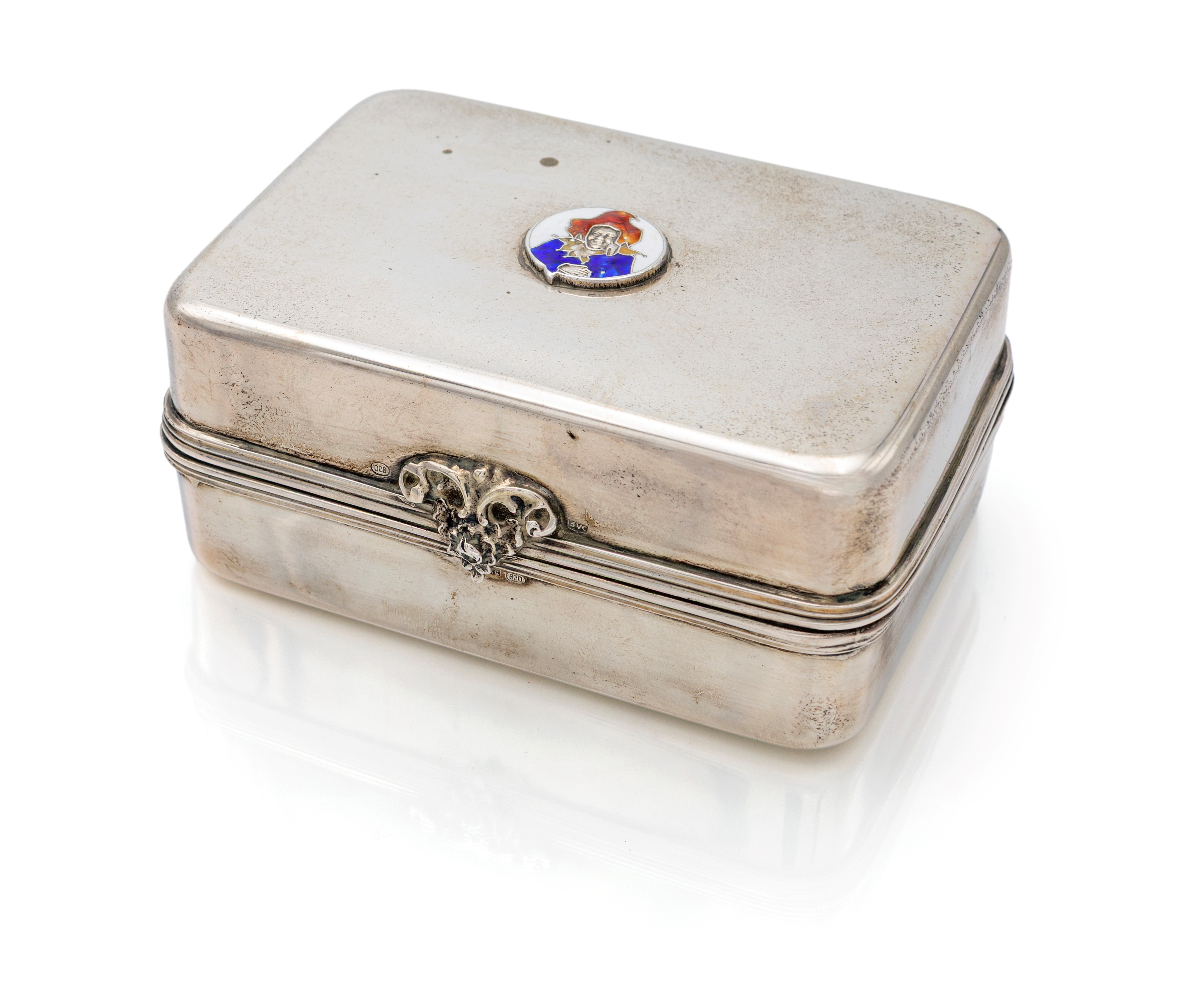 decorata sul coperchio da un piccolo mascherone applicato a raffigurare il volto di un Jolly in smalti policromi