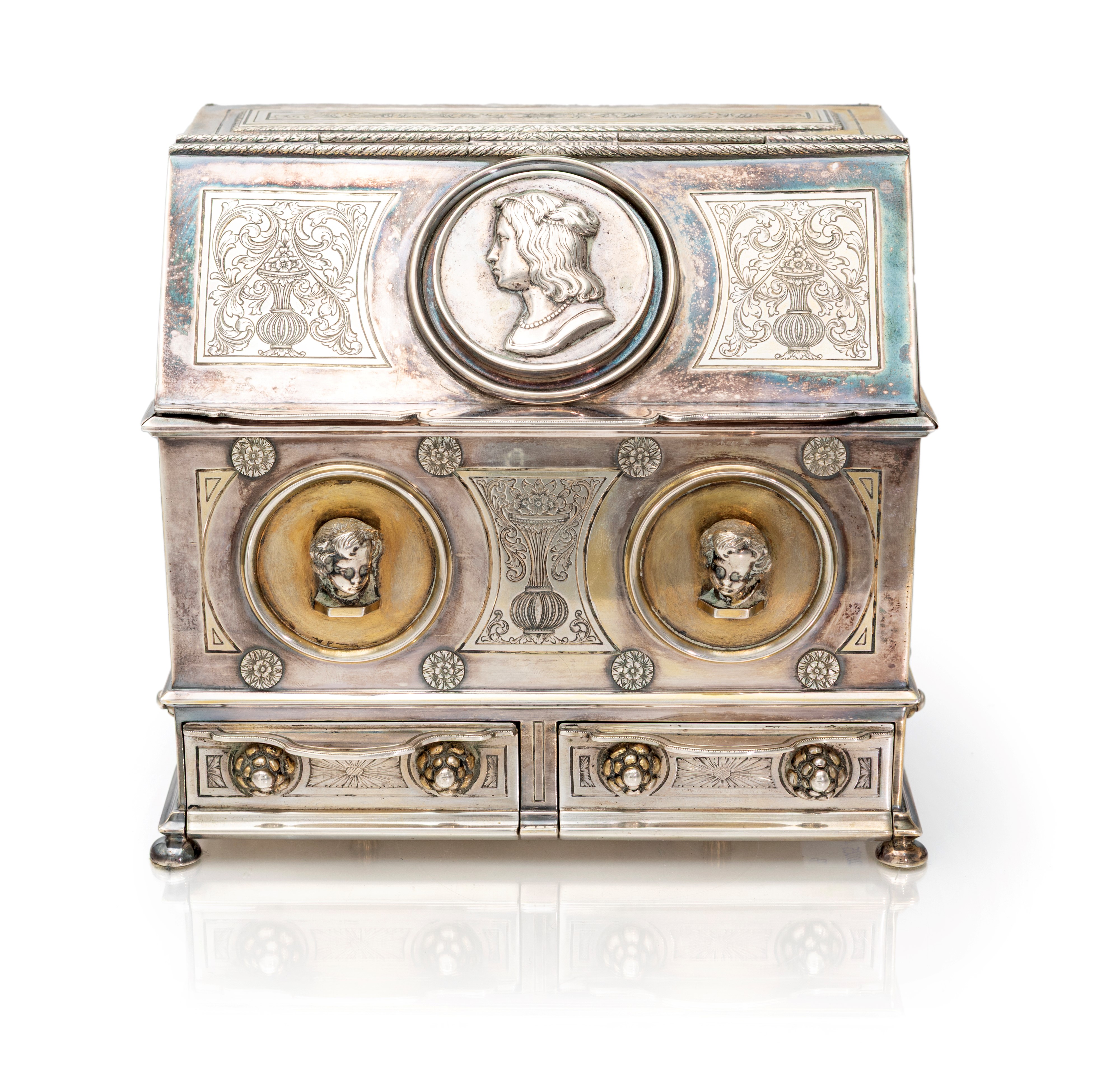 corpo decorato da composizioni vegetali e vasi fioriti minuziosamente incisi entro riserve, caratterizzato da tre medaglioni circolari con volti in basso e alto rilievo; fianchi guarniti da un fregio applicato in forma di drappo sospeso trattenuto da rosette; drupe aggregate simmetricamente disposte lungo la parte inferiore completano la descrizione. Parte superiore apribile rivelando scomparti interni estraibili; due cassettini nella parte frontale, piedi semisferici.