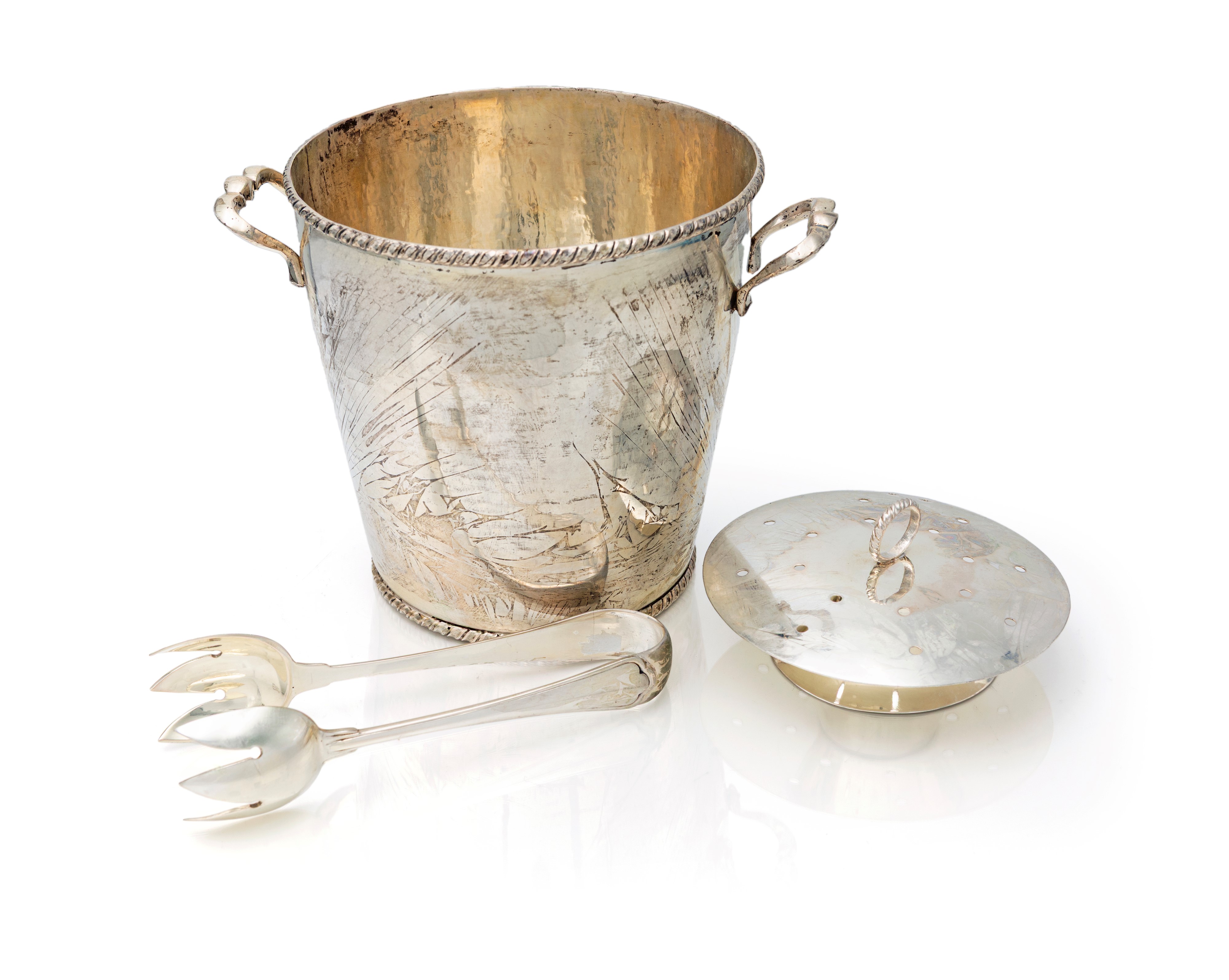 secchiello cilindrico con profilo superiore segnato da un cordolo; pinza con estremità a forma di tulipano