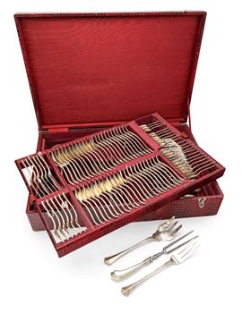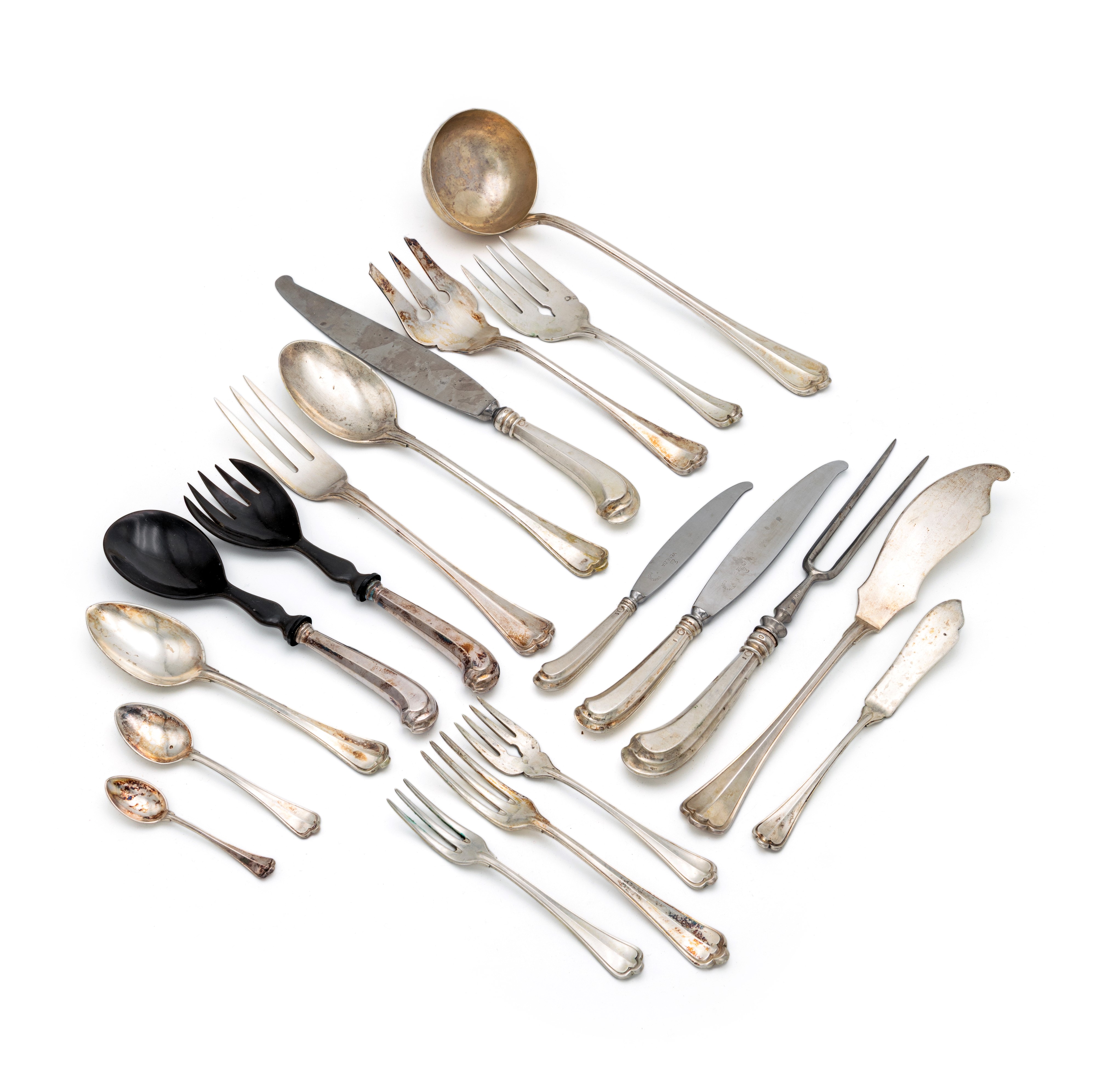 12 cucchiai da minestra (cm 19 - gr. 872); 12 forchette da pasto (cm 18 - gr. 832) ed altrettanti coltelli (cm 24,5); 6 forchette da pesce (cm 15,5 - gr. 242) ed altrettanti coltelli (cm 19 - gr. 272); 12 forchette da frutta (cm 15 - gr. 488) ed altrettanti coltelli (cm 19,7); 12 cucchiaini da caffè (cm 9,7 - gr. 142); 12 da tè (cm 12,7 - gr. 284) e 12 da dessert (cm 15,5 - gr. 588); due palette da dolce (cm 25,5 - gr. 260); due forchette ed un cucchiaio da portata (cm 25,5 e cm 24,8 - peso complessivo gr. 318); due posate da insalata in argento e corno (cm 22); forchettone e coltello da arrosto (cm 29 e 30,5 rispettivamente); forchetta e coltello per servire il pesce (cm 21,5 e cm 25,5 rispettivamente - gr. 240) ed un secondo set da portata per pesce di misura maggiore (cm 25 e cm 29,5 - gr. 248); un mestolo (cm 31,5 - gr. 244)