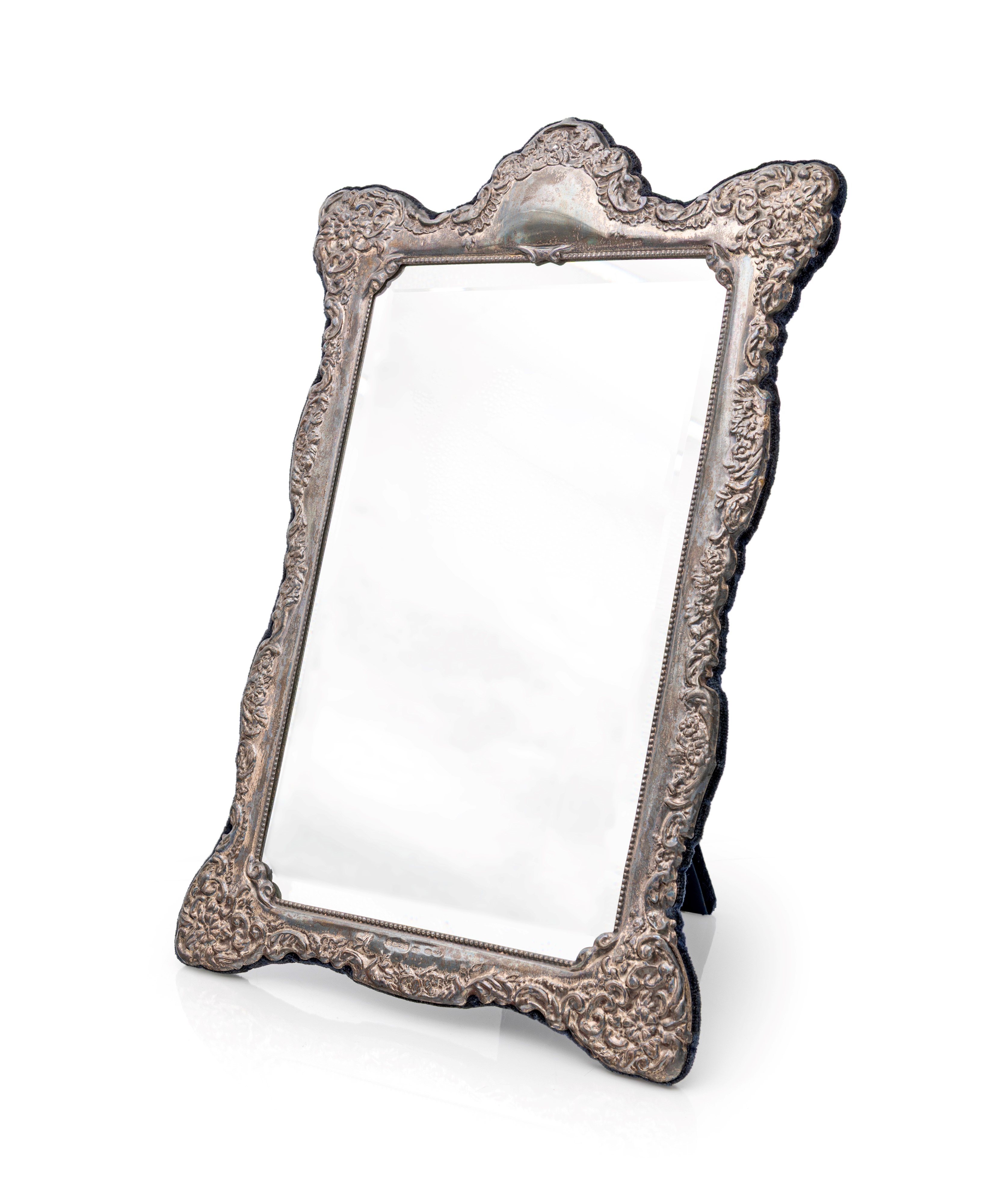 cornice sagomata con fitta decorazione a volute, motivi vegetali e fiori; specchio molato