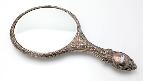 Specchio da toletta con manico in lamina d'argento sbalzata