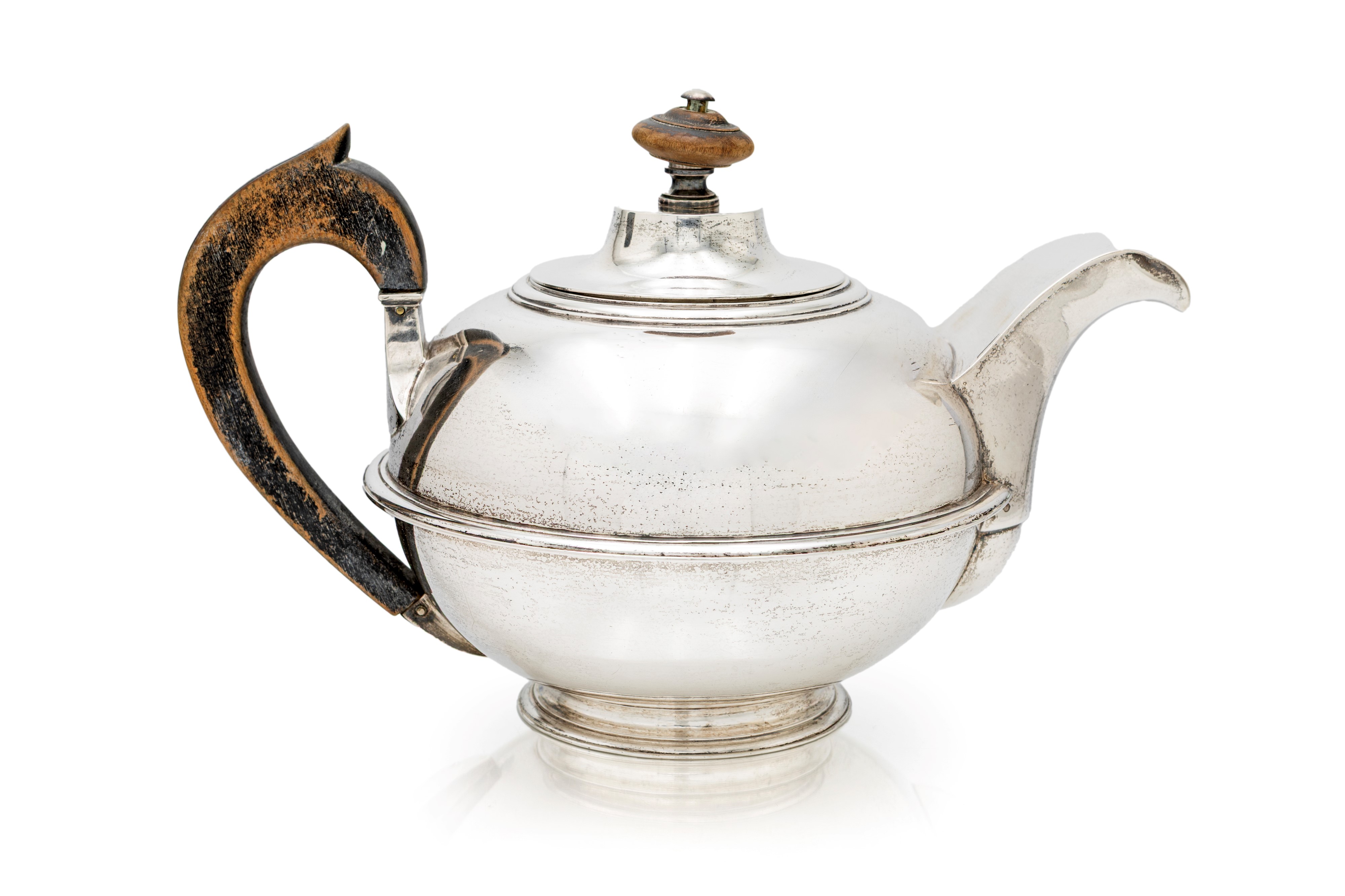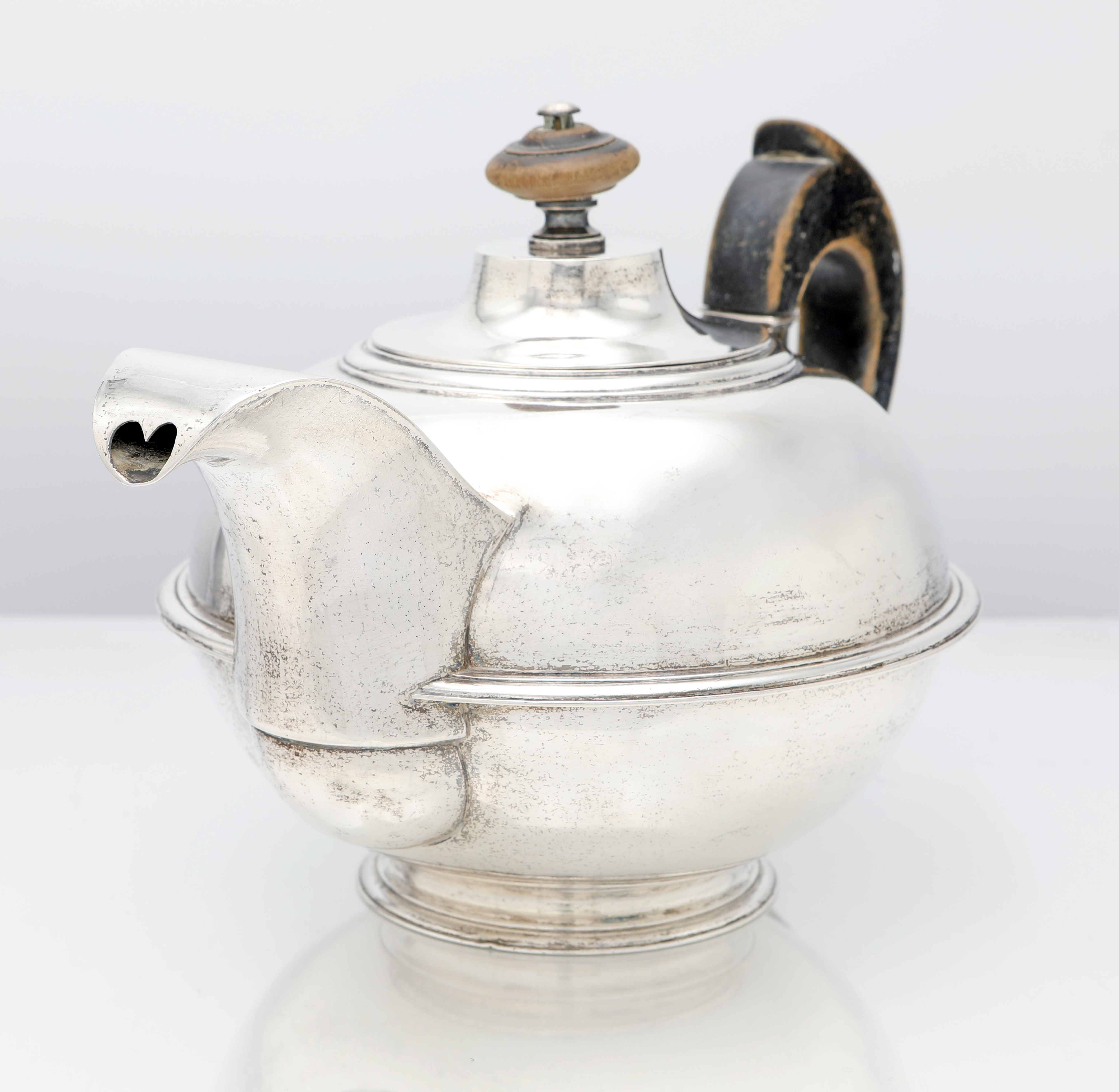 corpo sferico, versatoio a becco arcuato con apertura a cuore, manico in legno