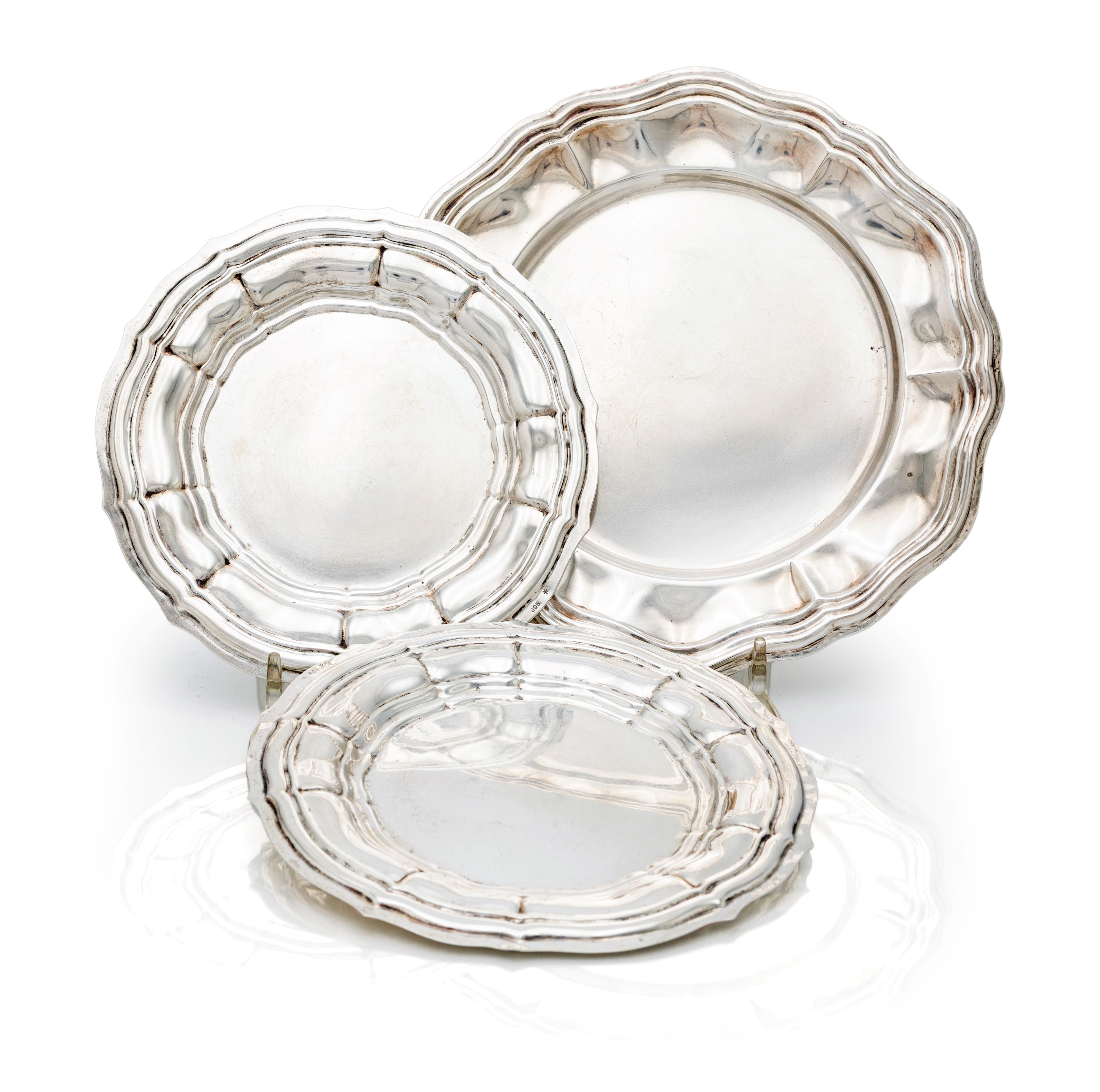 di forma circolare con ampia tesa sagomata percorsa da nervature ed orlo piatto; una coppia da dessert ed il più grande dell'argentiere Alessandro Corradini di Bologna
