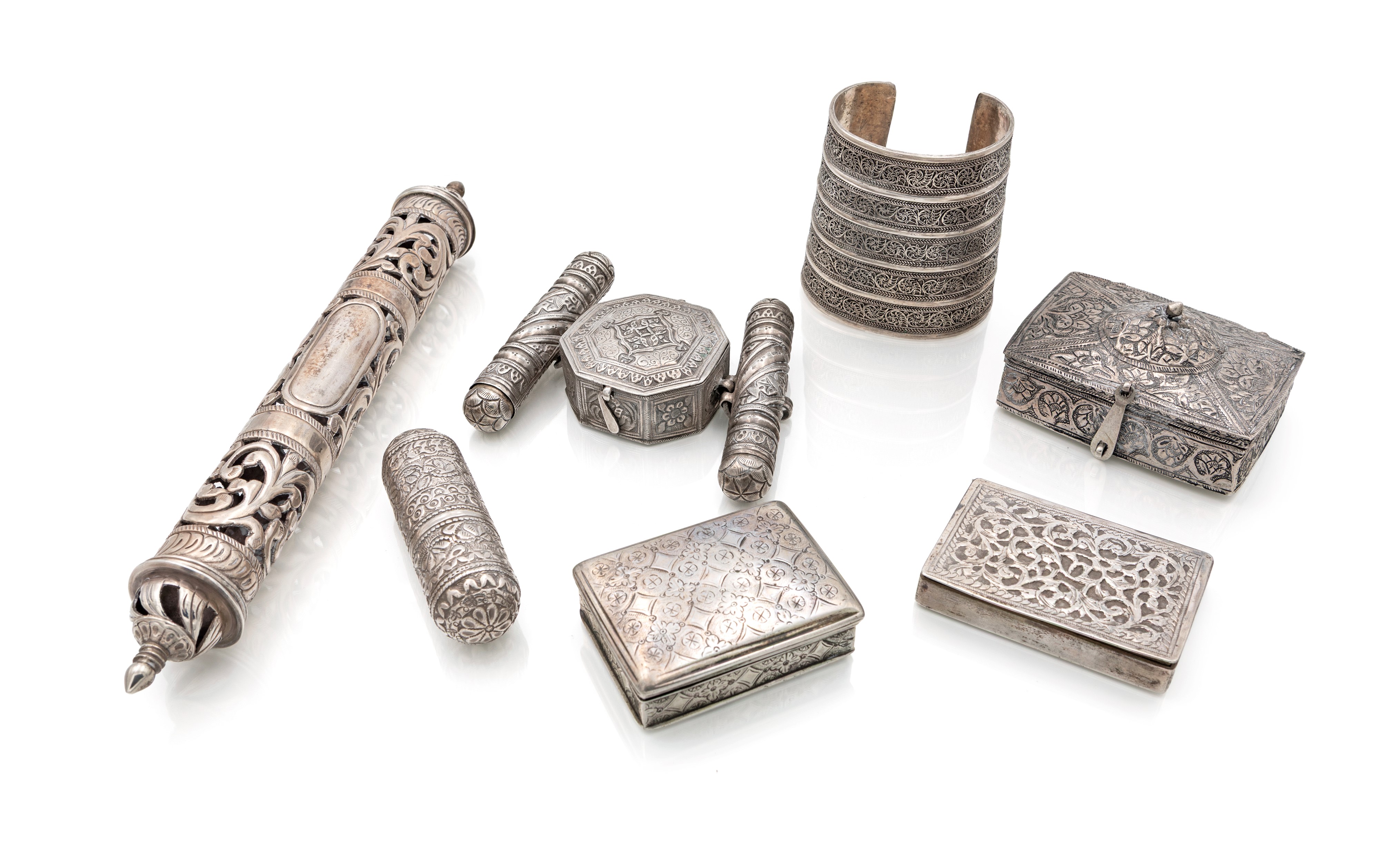 contenitore cilindrico traforato porta documenti (cm 25,5x3,3 - gr. 144); porta amuleto con volute vegetali incise (cm 8x2,5 - gr. 42); porta corano da braccio con scatola centrale ottagonale e due contenitori cilindrici (cm 9x9,5 - gr. 96); un bracciale rigido con decorazione a fasce in filigrana (cm 7,5x7x5,5 - gr. 124); una scatola portagioie con decorazione incisa (cm 4x8x6 - gr. 90) e due scatoline, entrambe rettangolari, una con fiori e losanghe incise (cm 2x6,5x4,5 - gr. 84), l'altra con volute vegetali incise ed emergenti dal fondo incusso (cm 1x7x5 - gr. 76)