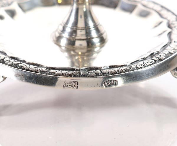 Vasetto centrotavola in argento con fiori e foglie curvate