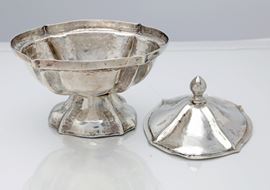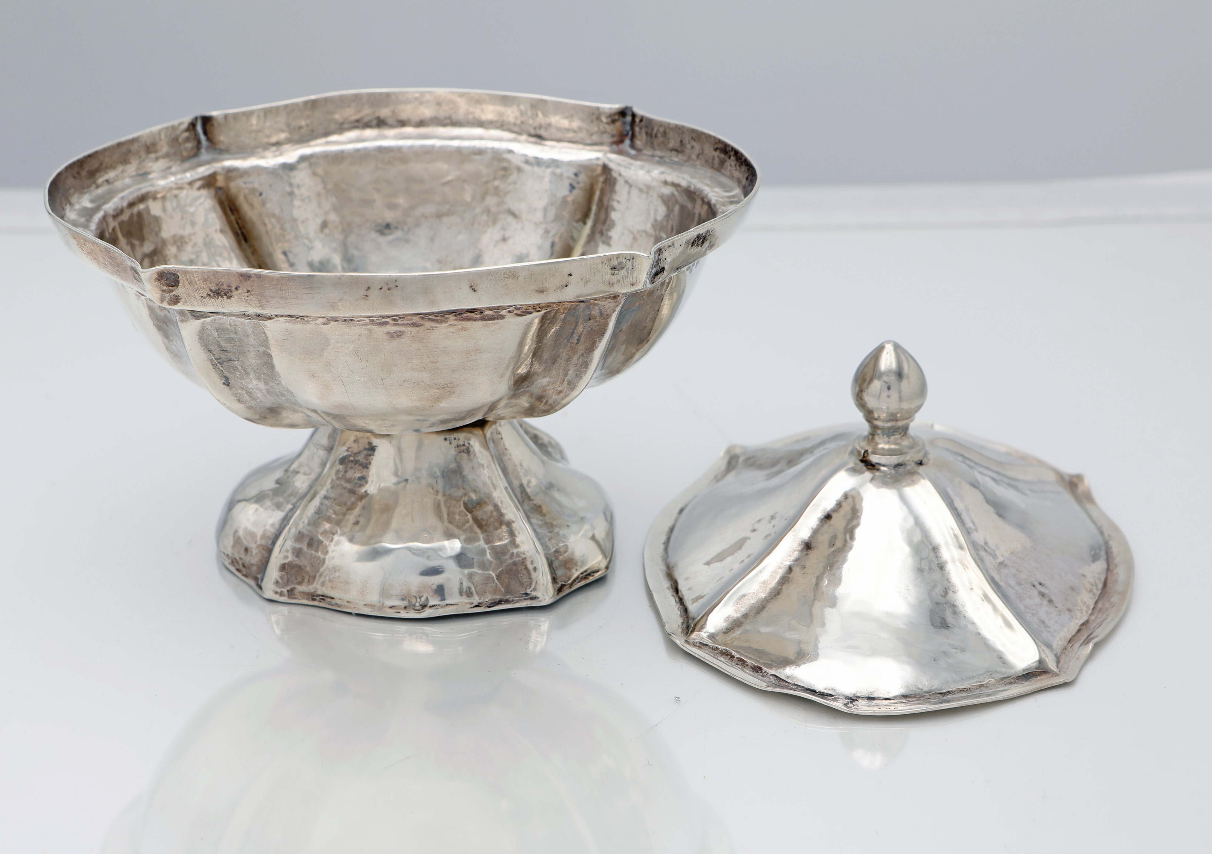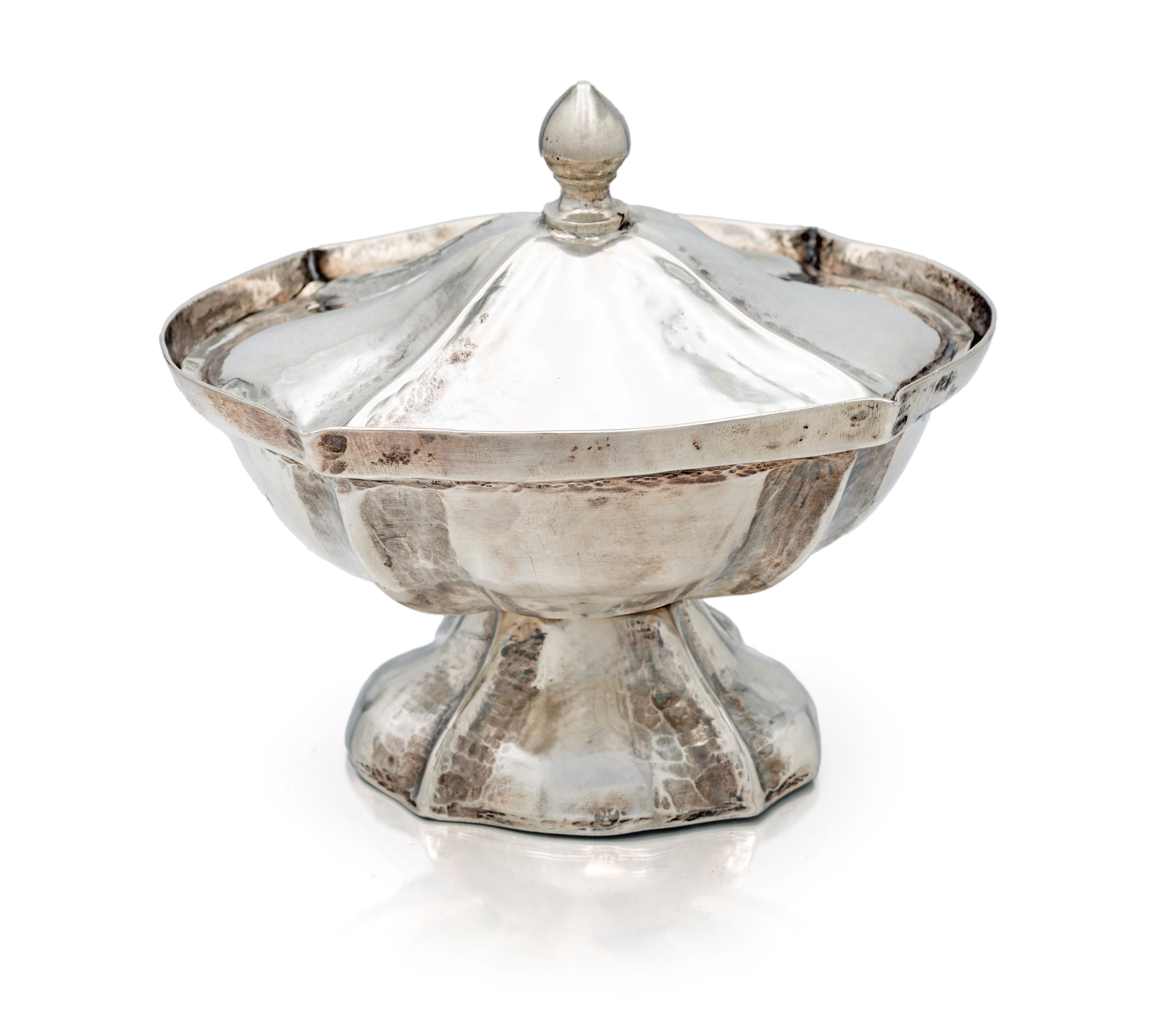 vaschetta ovale battuta a mano con nervature e basso piede troncoconico; coperchio ad incasso sormontato da pomolo a pigna