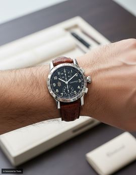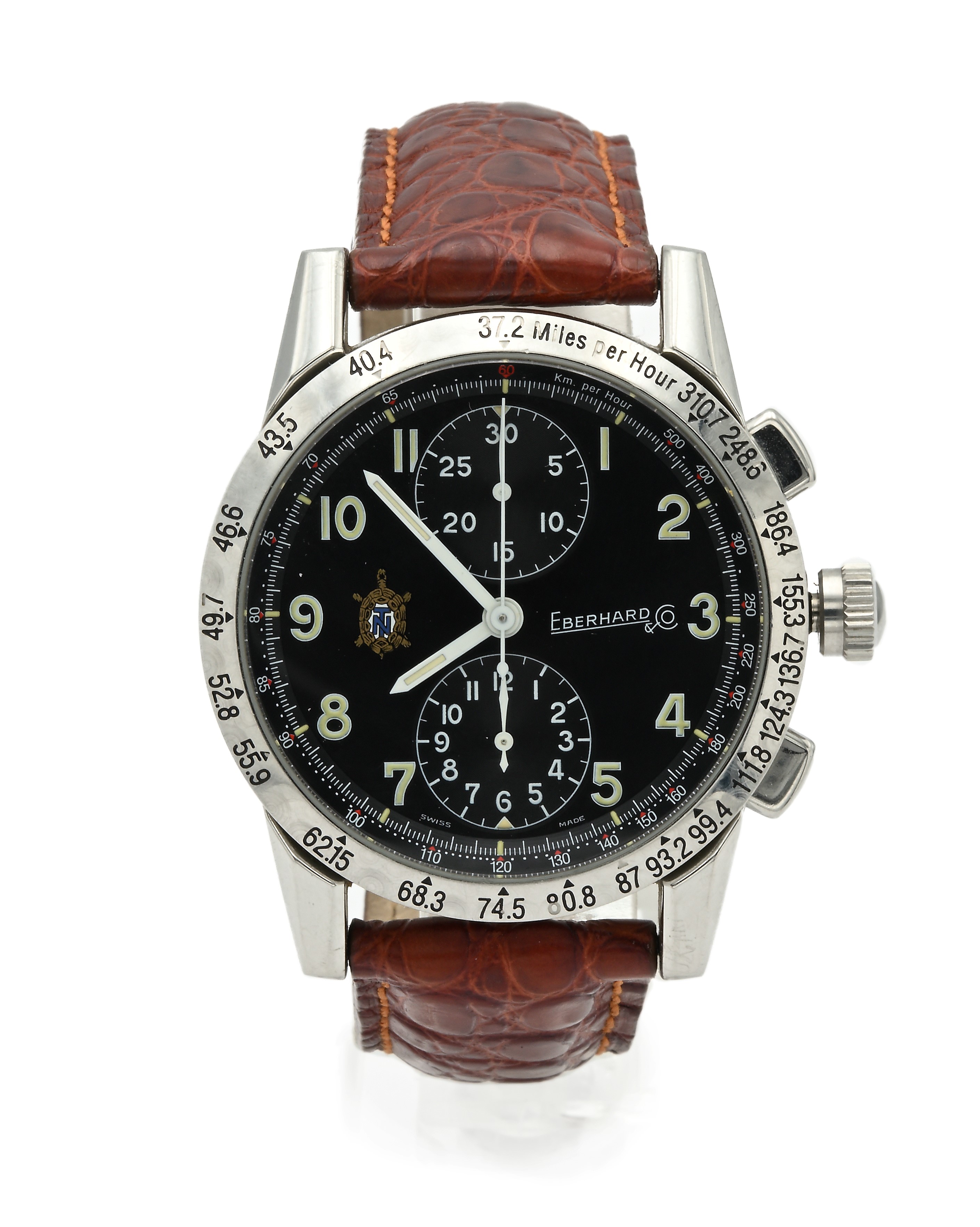 Acciaio. Ref. n° 31030. Cassa firmata n° C0504, fondello con viti, lunetta graduata in miglia orarie, pulsanti rettangolari, fibbia in acciaio firmata, quadrante firmato, simbolo della tartaruga aperto, numeri arabi luminescenti, sommatore dei 30 minuti e delle 12 ore, scala tachimetrica su rehaut. Movimento firmato, calibro automatico n° 7750, bilanciere monometallico, spirale piana. Controscatola, astuccio, libretto con garanzia. Acquistato nel 1994.