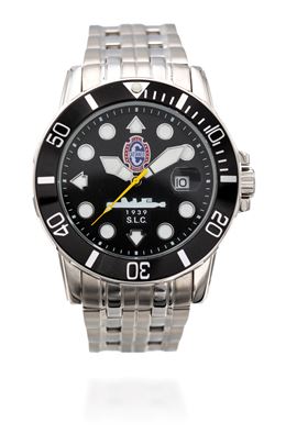 Quadrante nero, indici entro bicchierini, secondi al centro, data. Sopra è raffigurato lo stemma di Cabi Cattaneo, in basso raffigurazione di S.L.C. (siluro a lenta corsa)