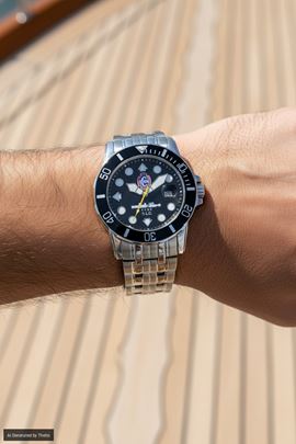Orologio sub, cassa in acciaio, ghiera nera graduata, fondello a vite.