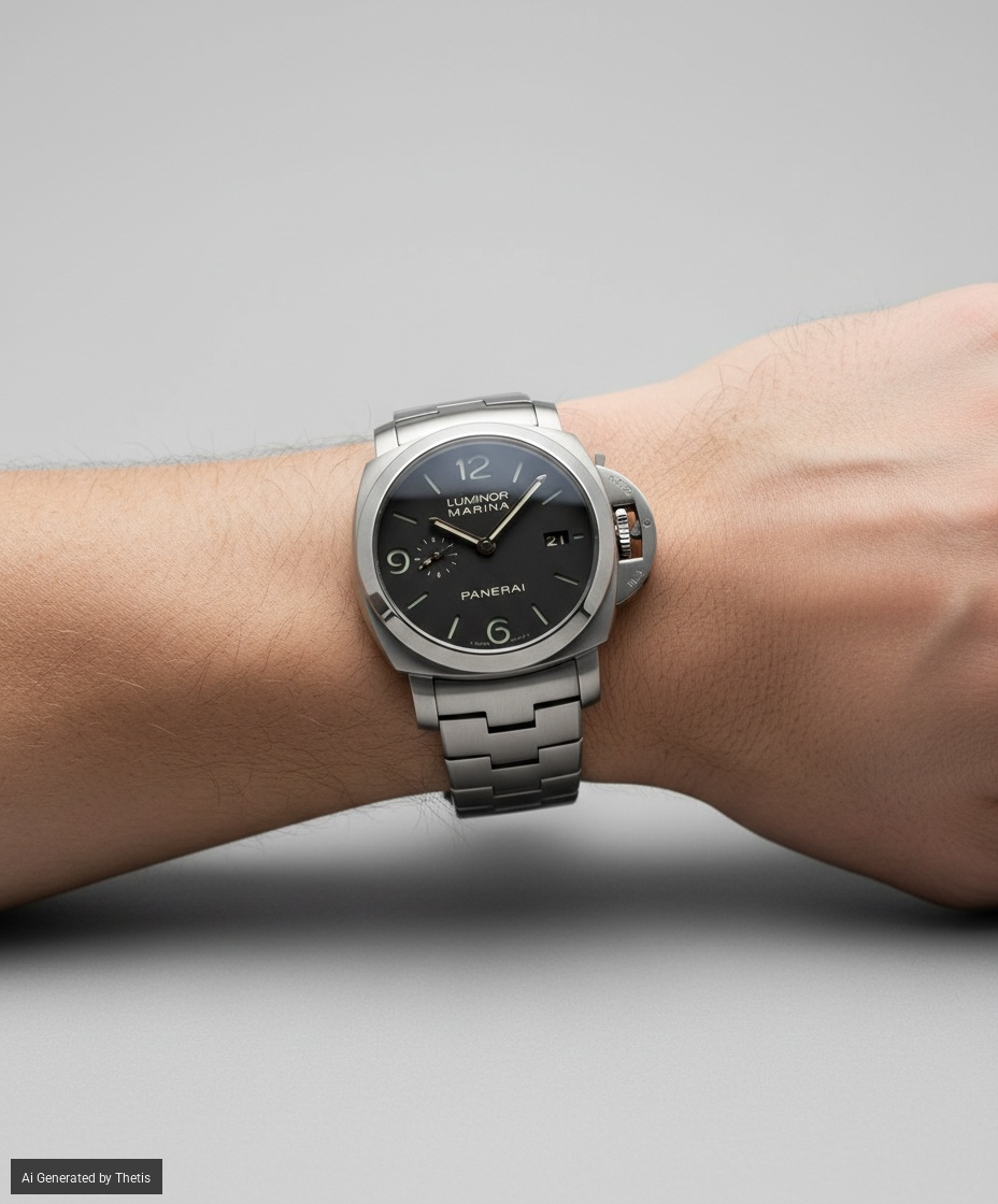 Quadrante nero, indici luminescenti, secondi al 9, data.