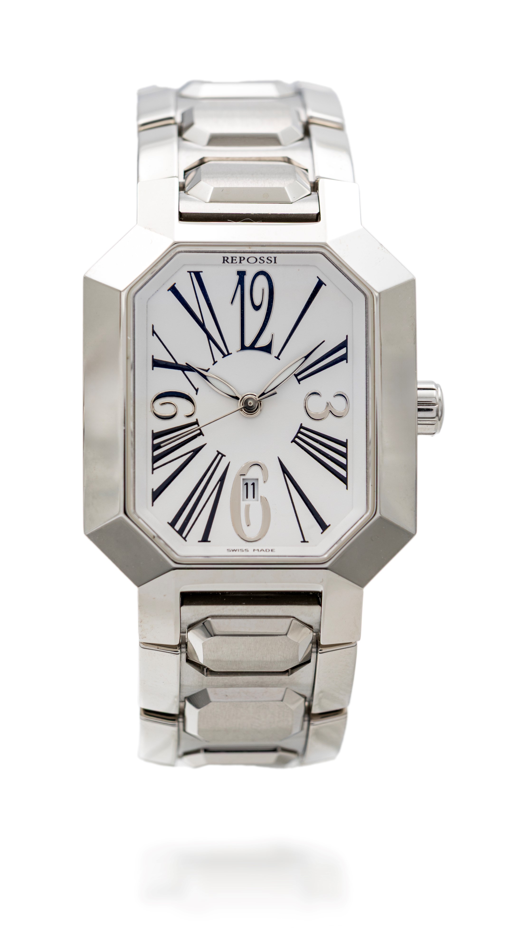 Acciaio. Ref. R1SQ. Cassa n° 1501, fondello con viti, bracciale in acciaio con chiusura a deployant. Quadrante bianco, numeri romani stampati e numeri arabi applicati, secondi al centro, data. Movimento al quarzo.