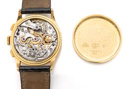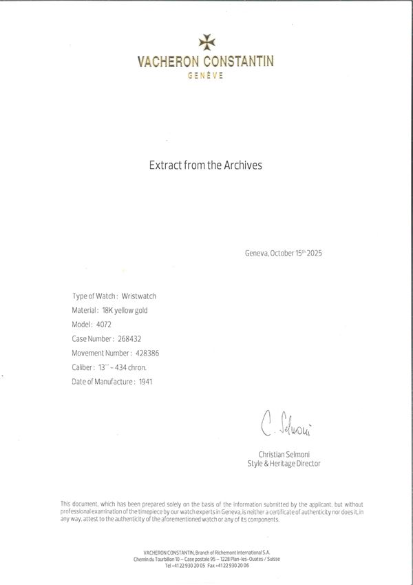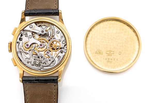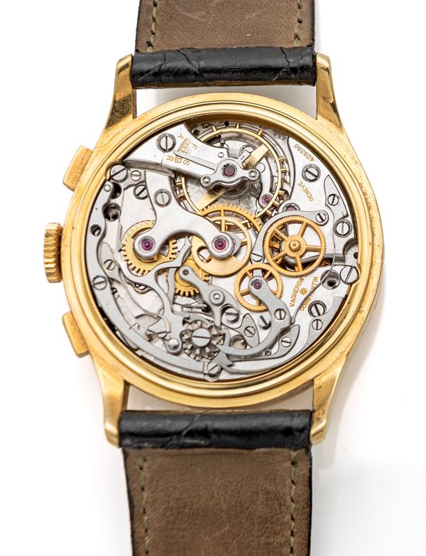 Oro giallo 750/000. Cassa n° 268432, fondello a scatto. Quadrante dorato con patina, indici applicati, quadrantini ausiliari dei secondi e del sommatore dei minuti, scala tachimetrica. Movimento manuale n° 428386, bilanciere monometallico con viti, spirale Breguet. Fibbia Vacheron Constantin in oro 750/000, recente. Corredato di estratto dagli archivi Vacheron Constantin del 15 ottobre 2025