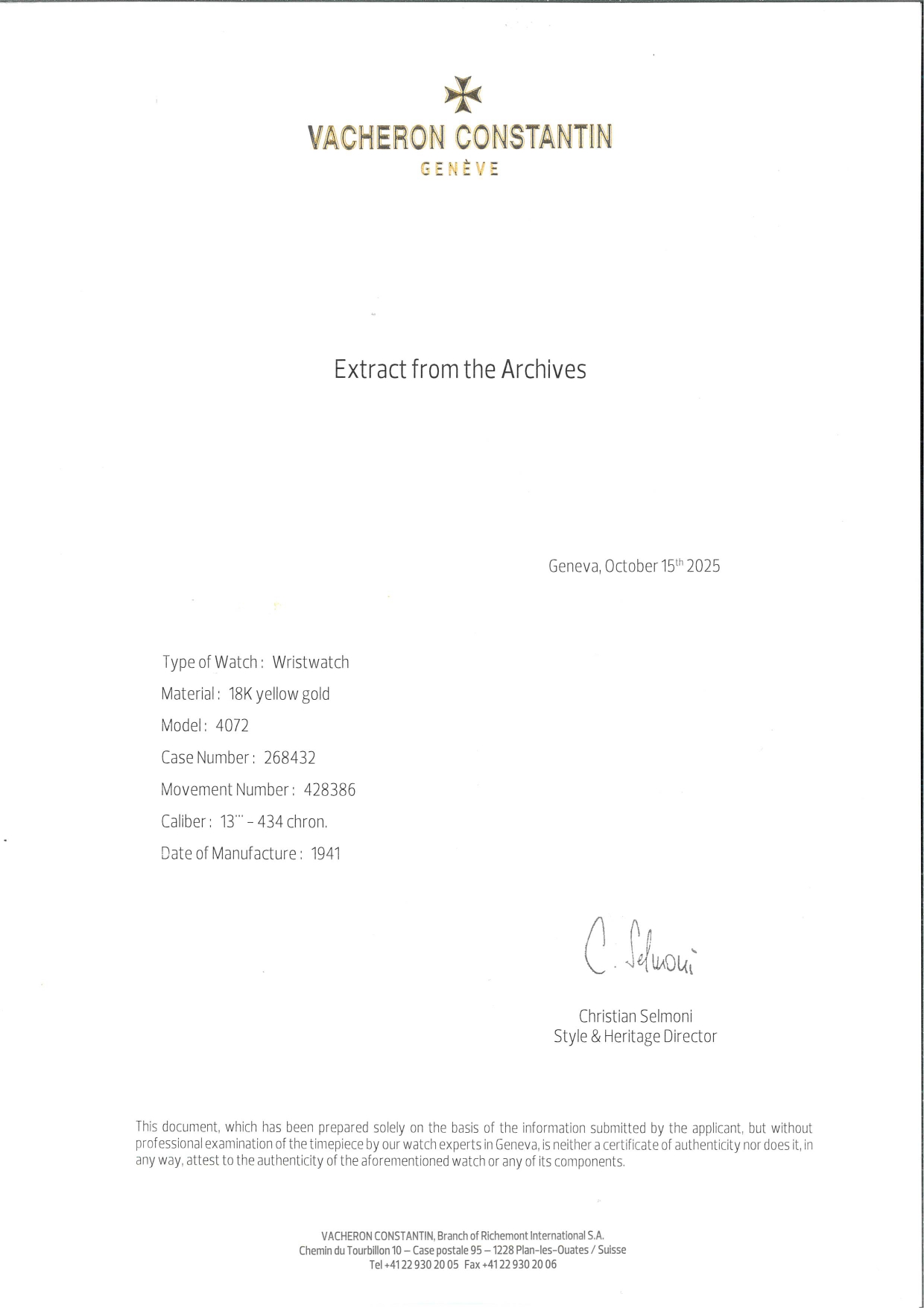 Vacheron & Constantin mod. 4072 cronografo da polso in oro, 1941