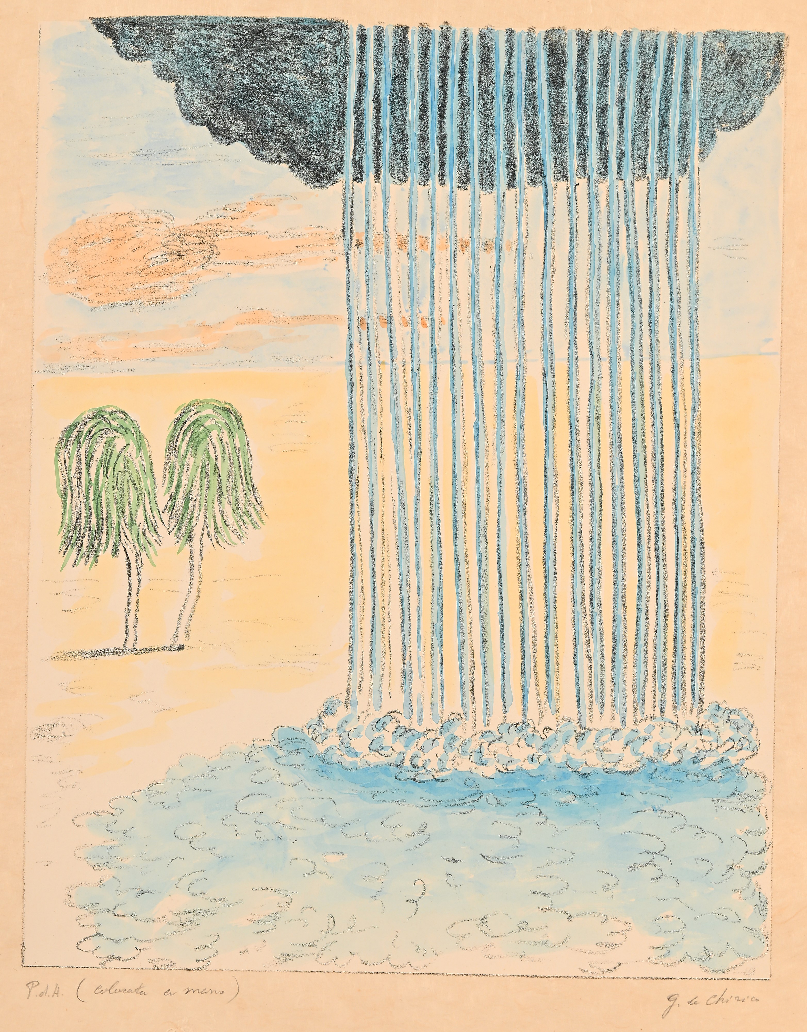 Firma e numerazione "G. De Chirico p.d.a. colorata a mano". Timbro a secco "Giorgio De Chirico" e "Alberto Caprini stampatore in Roma".
