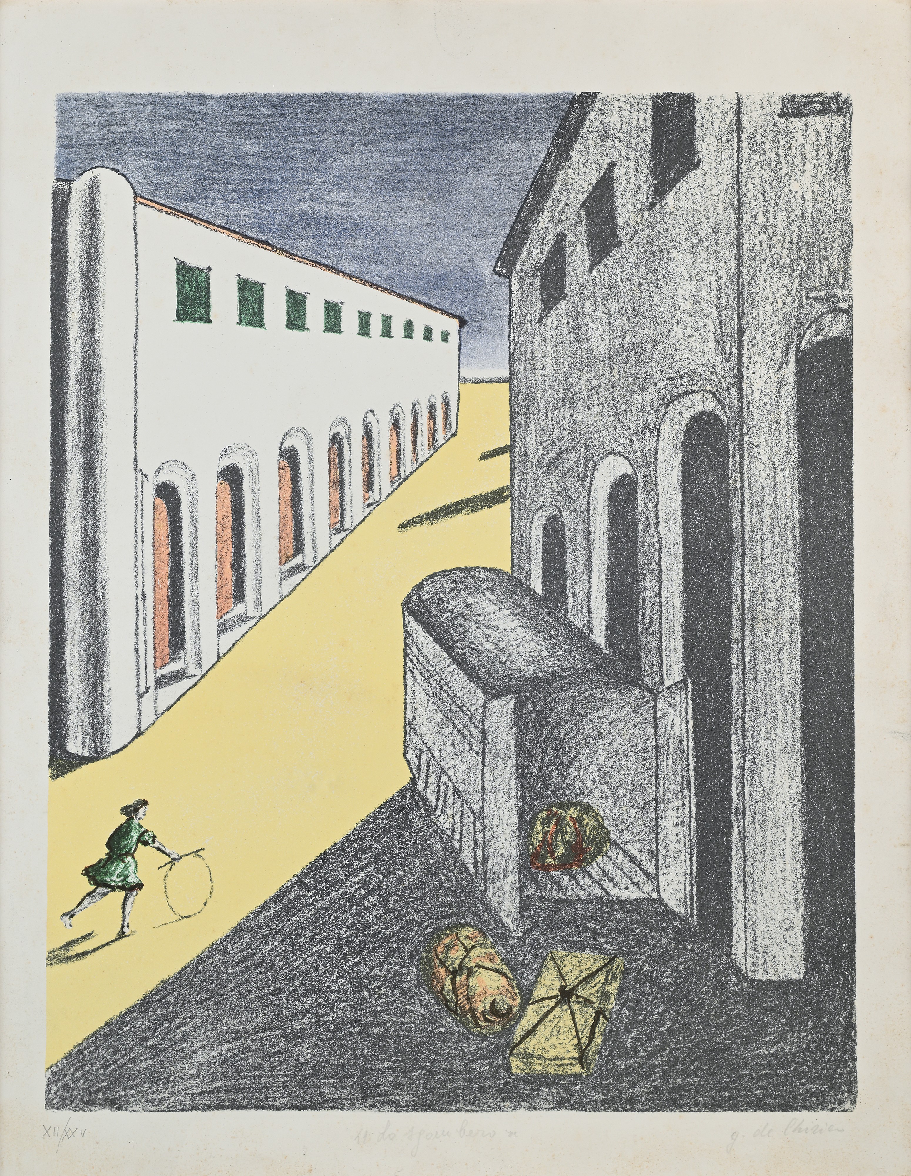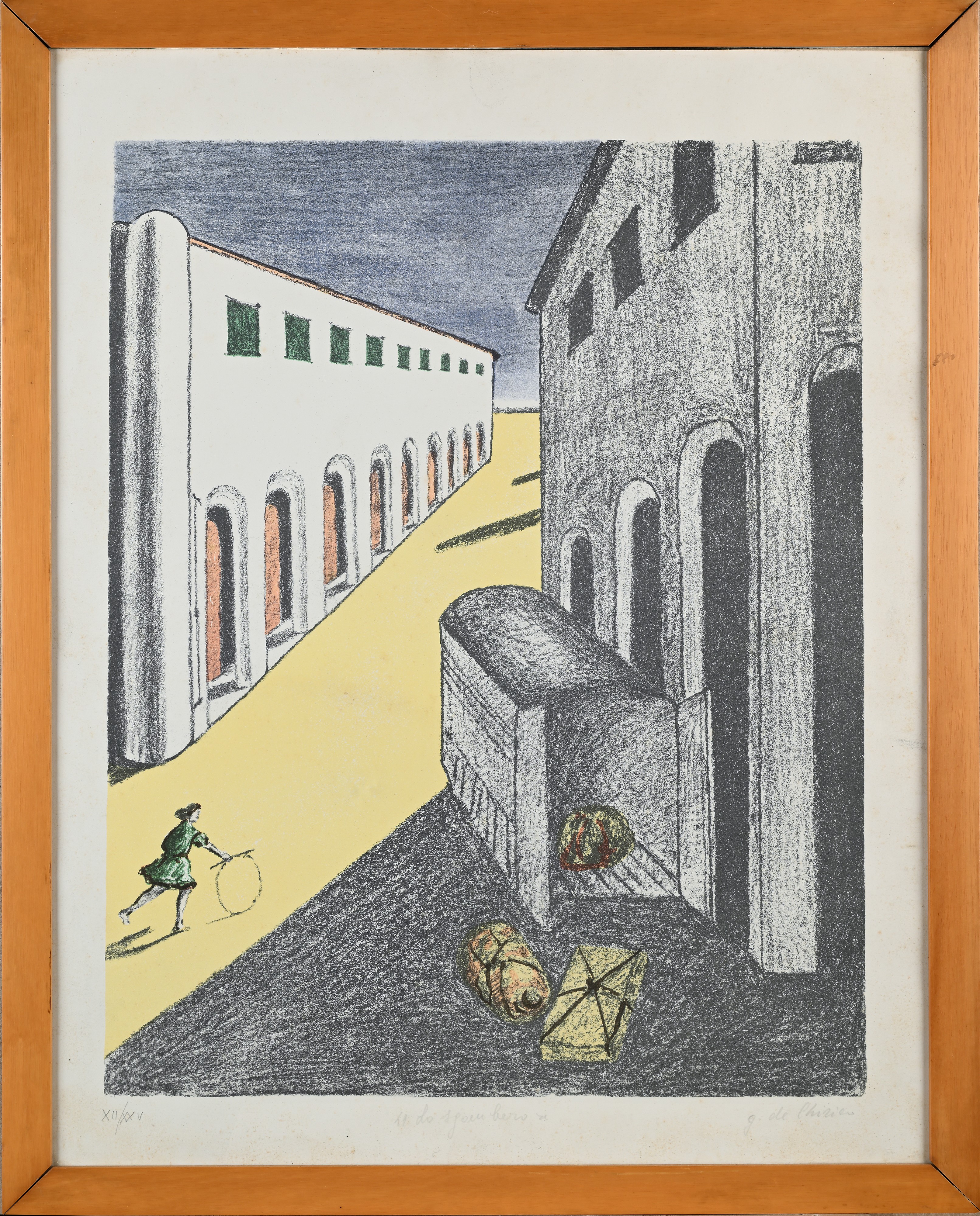 Firma, titolo e numerazione "G. De Chirico, Lo Sgombero, XII/XXV"