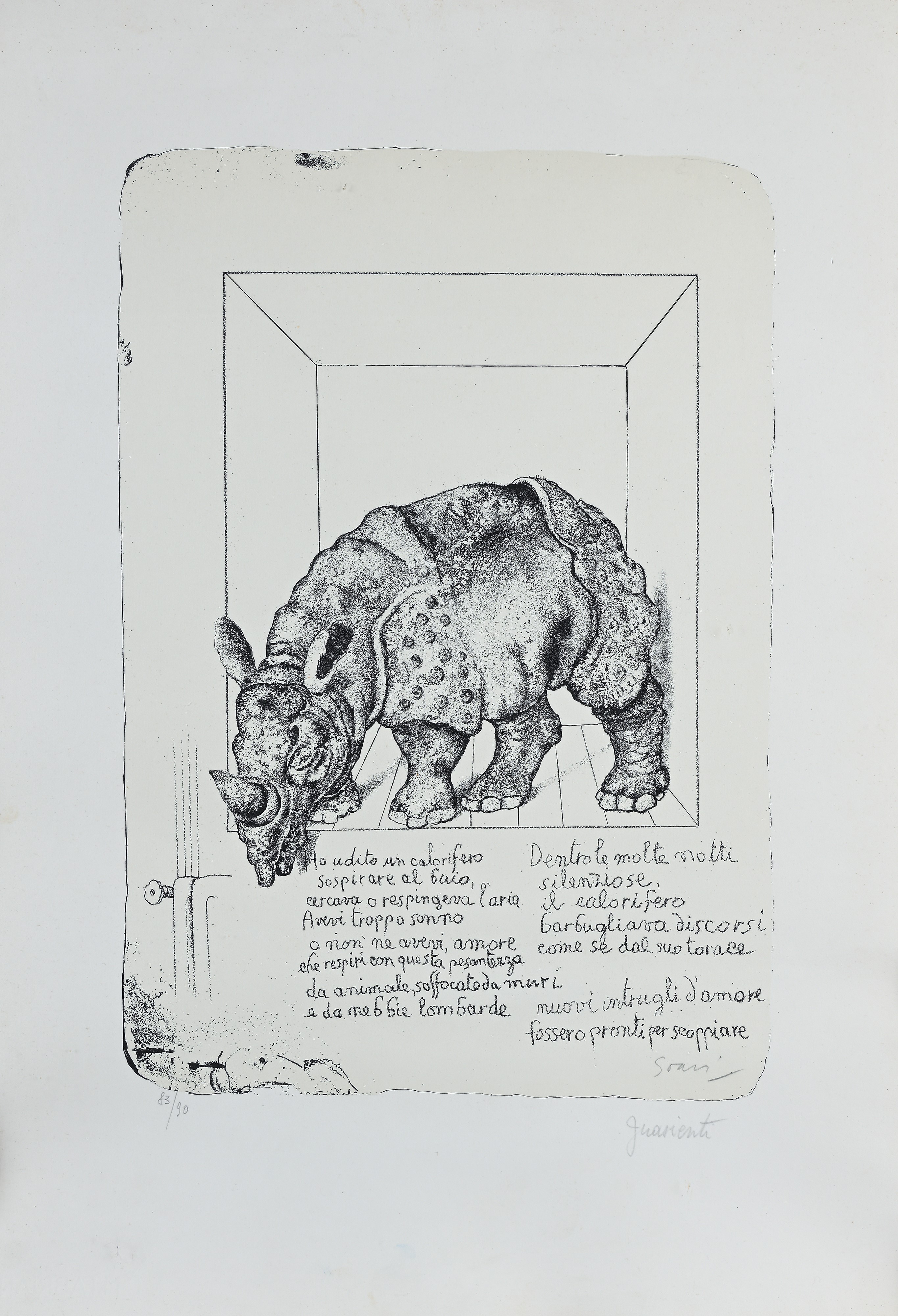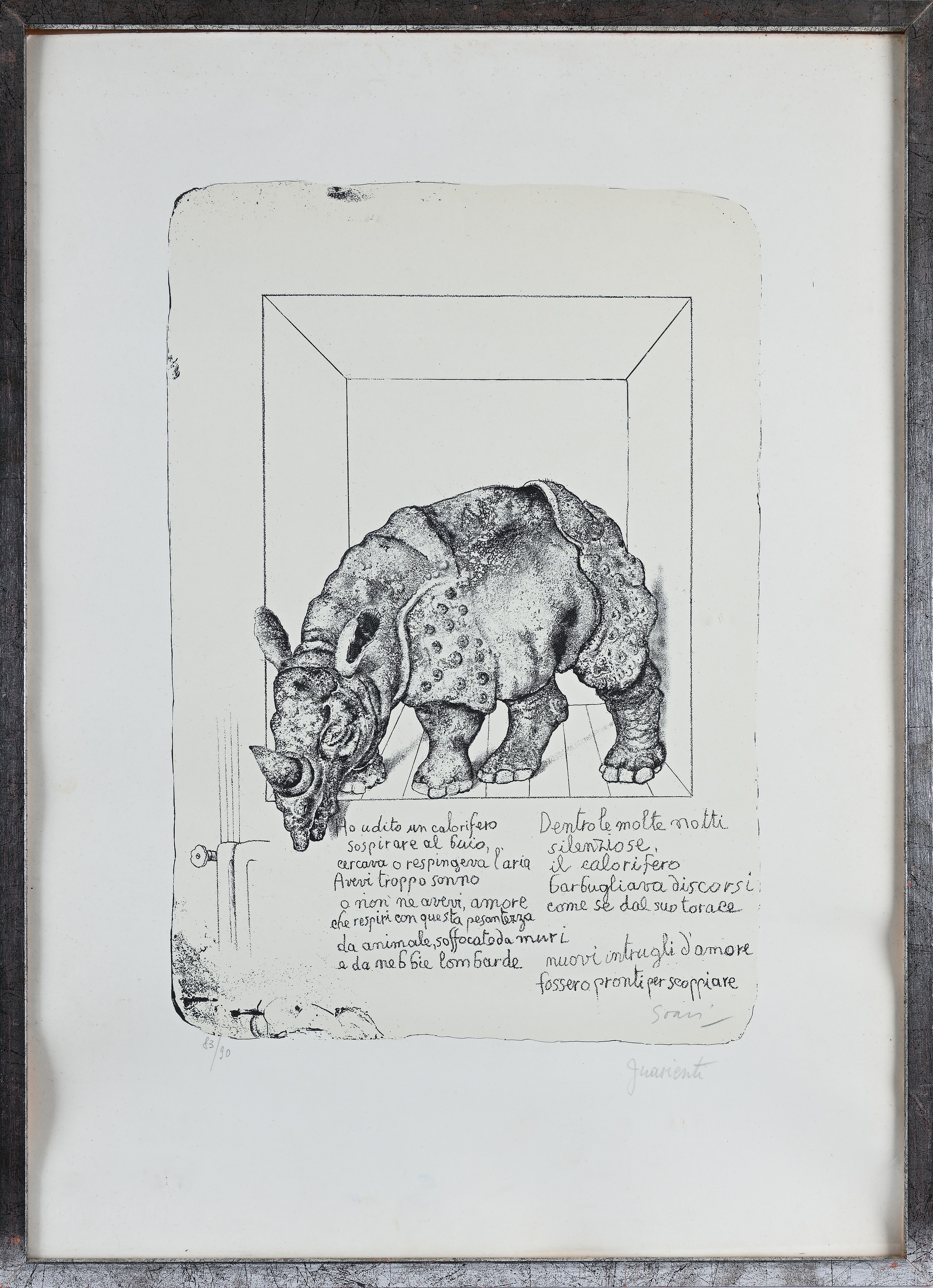 Litografia di Carlo Guarienti e Poesia di Giorgio Soavi, entrambe firmate "Soavi" e "Guarienti". Numerata in basso a sinistra 83/90