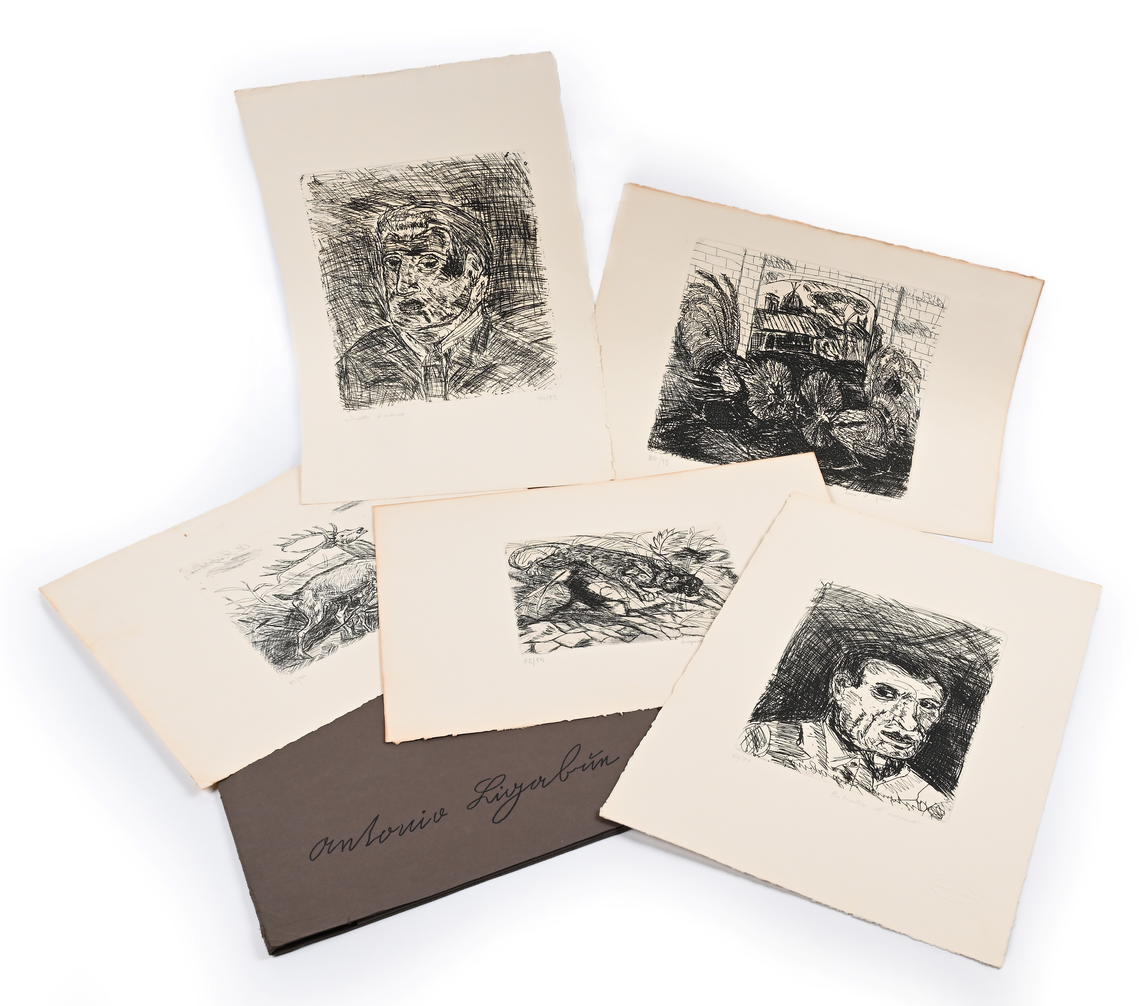 Lotto di 5 incisioni da Antonio Ligabue, tiratura successiva del 1970 realizzata da Grafica Editoriale Roma. Ogni incisione misura cm 50x35 circa e al retro reca etichetta della Grafica Editoriale Roma. Tutte le incisioni sono numerate e intitolate e con timbro a secco dell'editore.