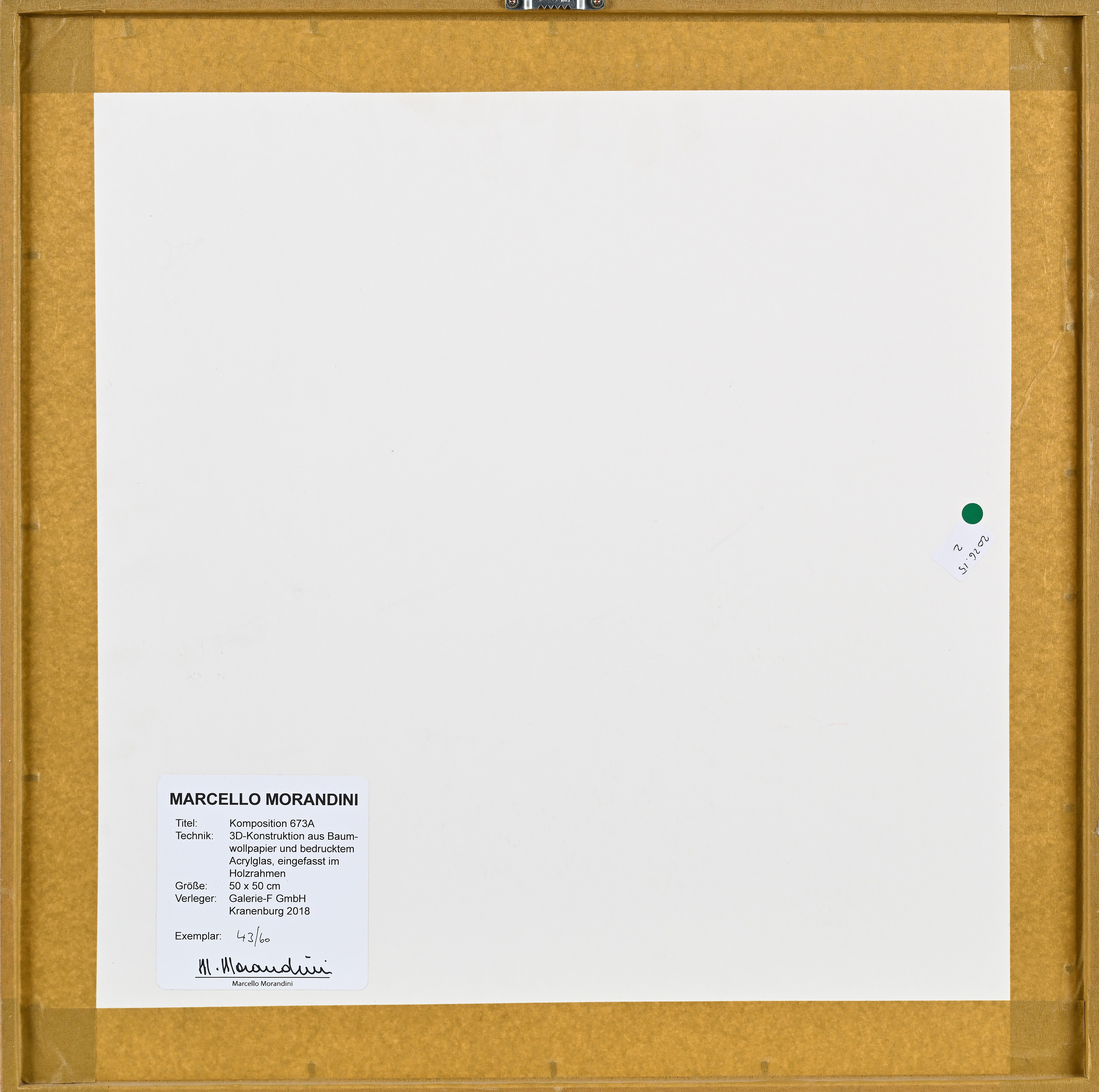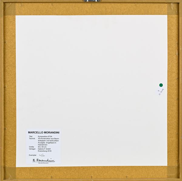 Al verso reca cartiglio di Marcello Morandini con specifiche tecniche, numerazione a pennarello 43/60 e firma a pennarello "M. Morandini". Edizioni Galerie-F Gmbh Kranenburg 2018