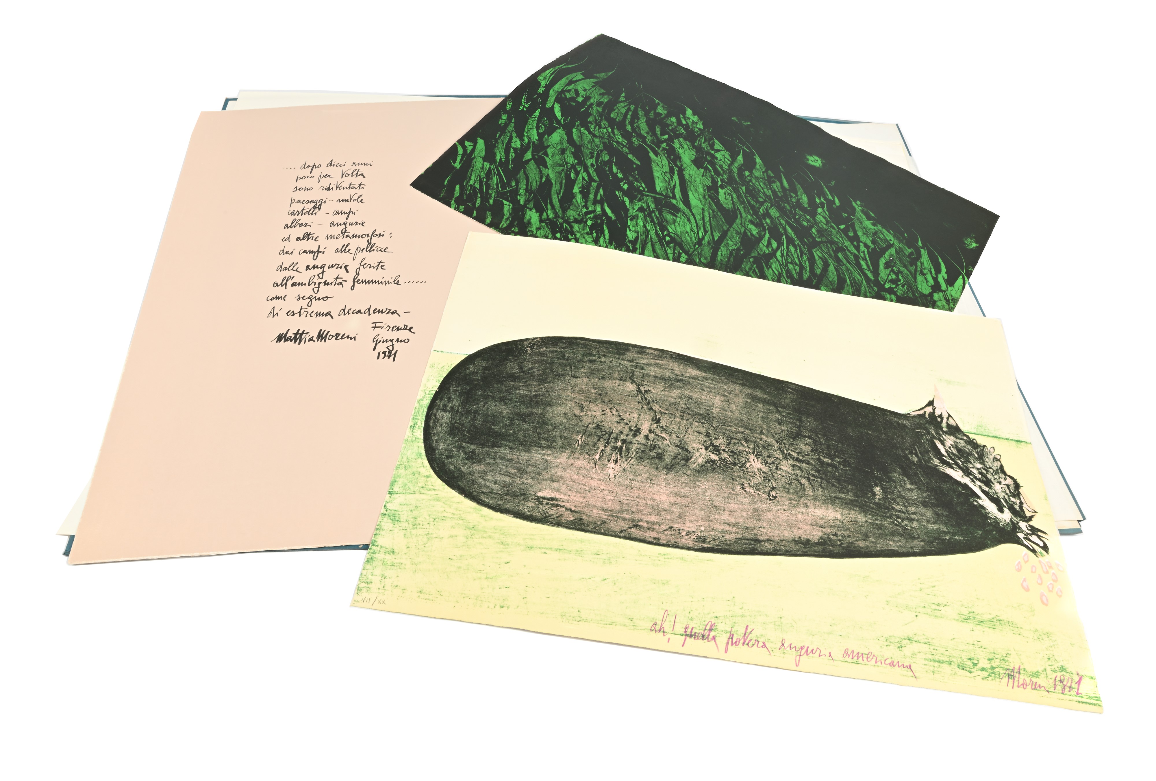 Sei litografie di Mattia Moreni entro cartellina rigida originale della Stamperia Il Bisonte, Firenze, che ha curato l'edizione e stampato le grafiche. Ogni litografia è firmata e numerata "M. Moreni '71, VII/XX". Ogni litografia misura cm 50x70