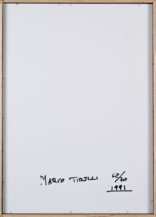 Tre litografie cm 78x55,5 l'una entro cornice cm 80,5x58,5 l'una. La litografia alla base è firmata, datata e numerata a matita al retro "Marco Tirelli 67/70, 1991".