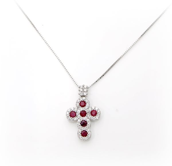 Oro giallo e bianco 750/000. Rubino centrale in taglio cabochon e diamanti in taglio rotondo. Peso complessivo gr. 9