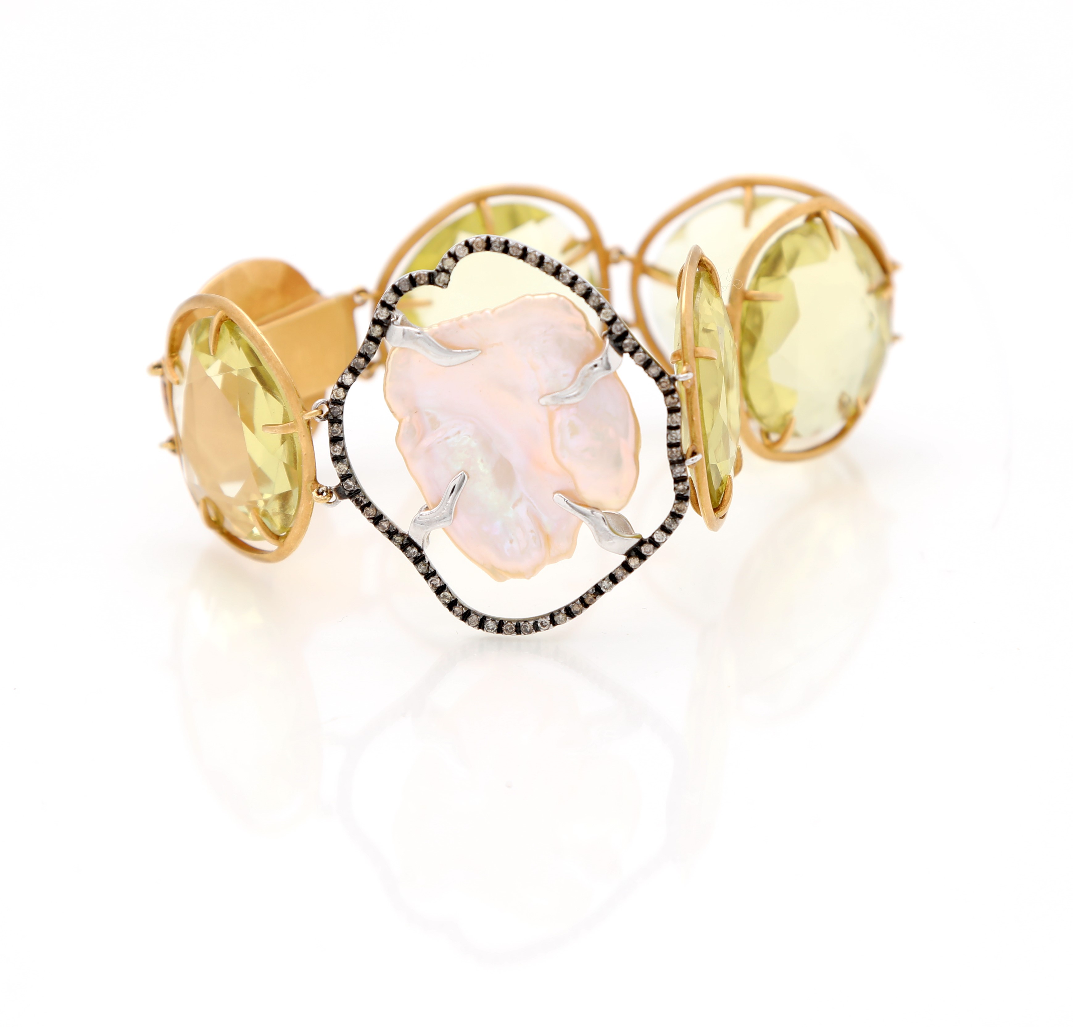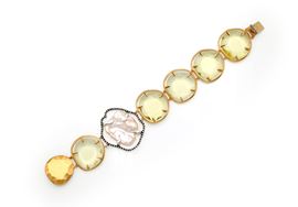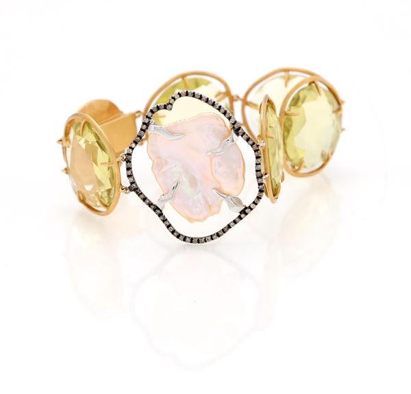 Bracciale in oro, quarzi, perla scaramazza e diamanti