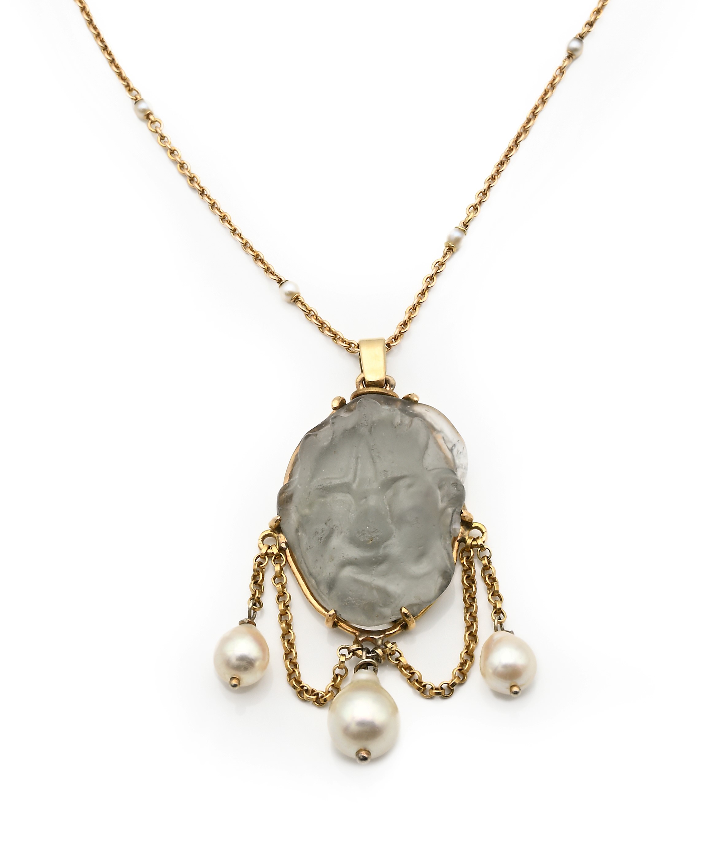 Collana antica in oro, perle, cammeo su pasta vitrea