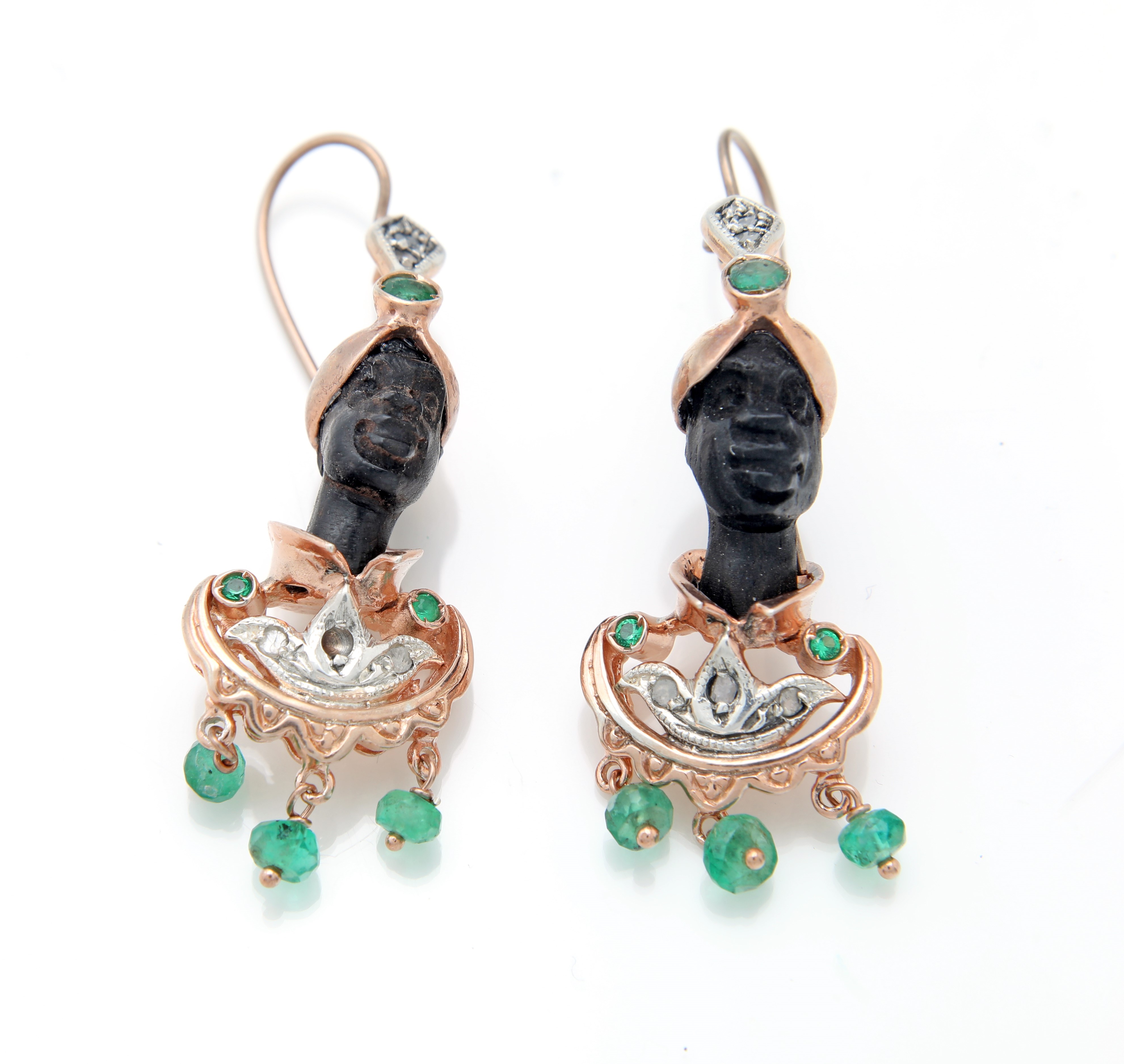 Coppia di orecchini moretti in oro, argento, diamanti, smeraldi ed ebano.