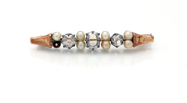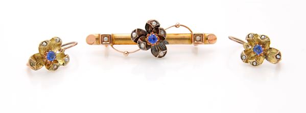 Coppia di pendenti e spilla antica in oro e pietre rosse