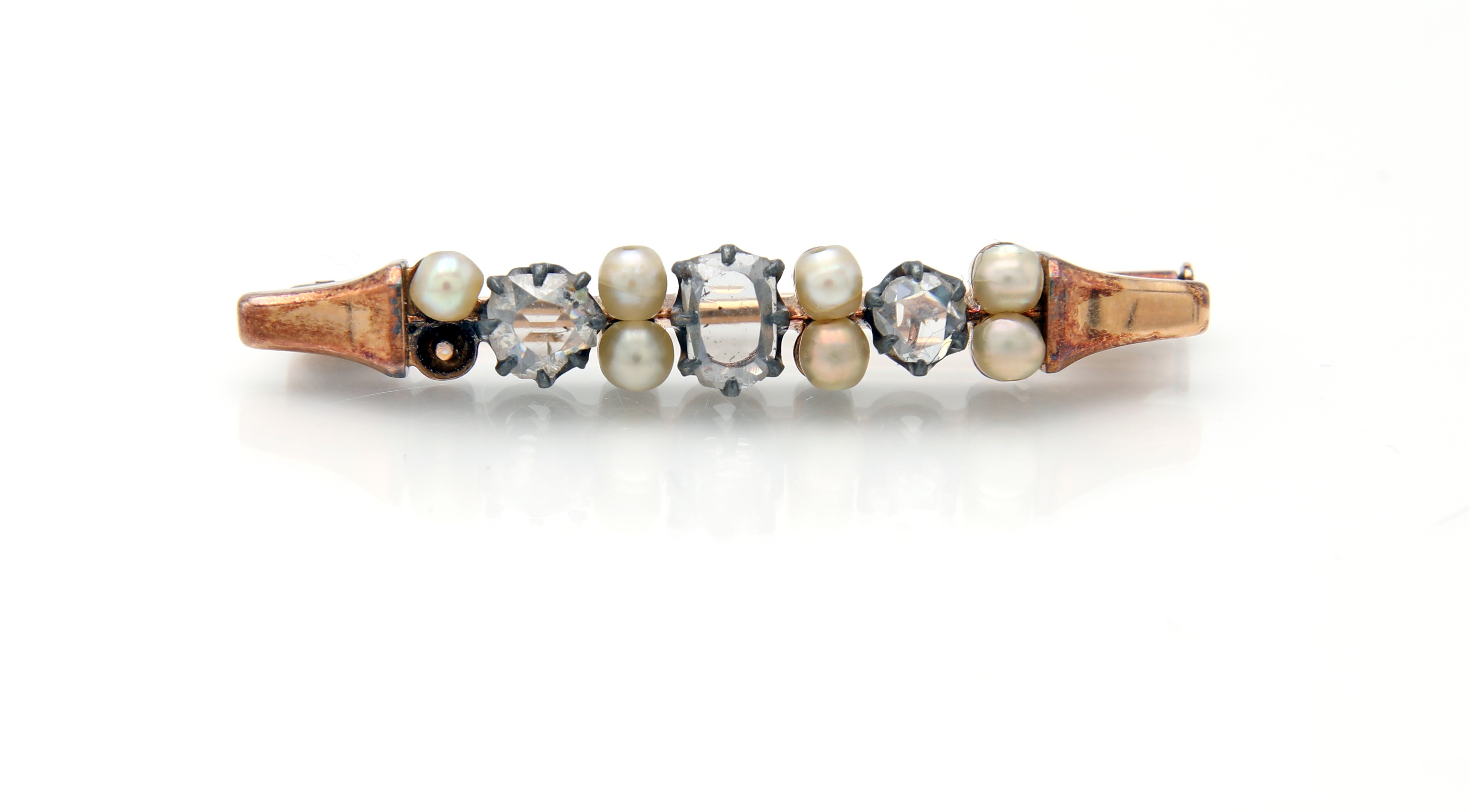 Spilla a barretta antica in oro, argento, perle e diamanti