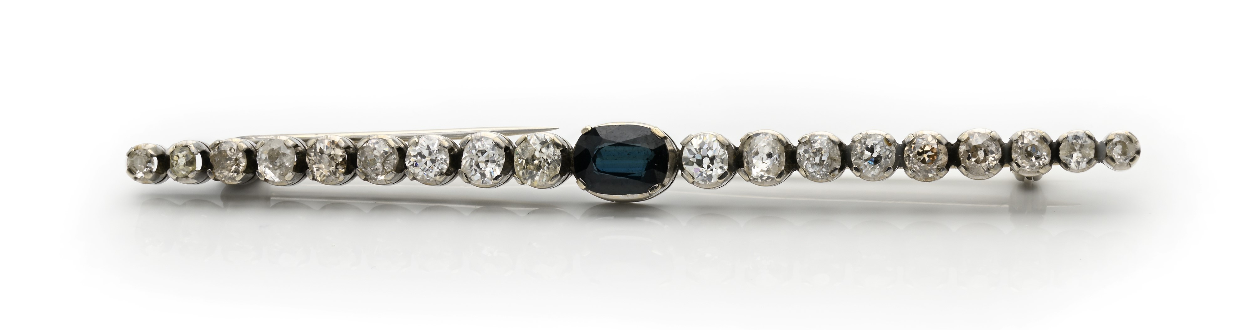 Spilla a barretta in oro, zaffiro centrale e diamanti.