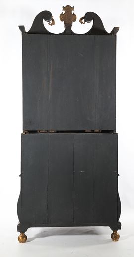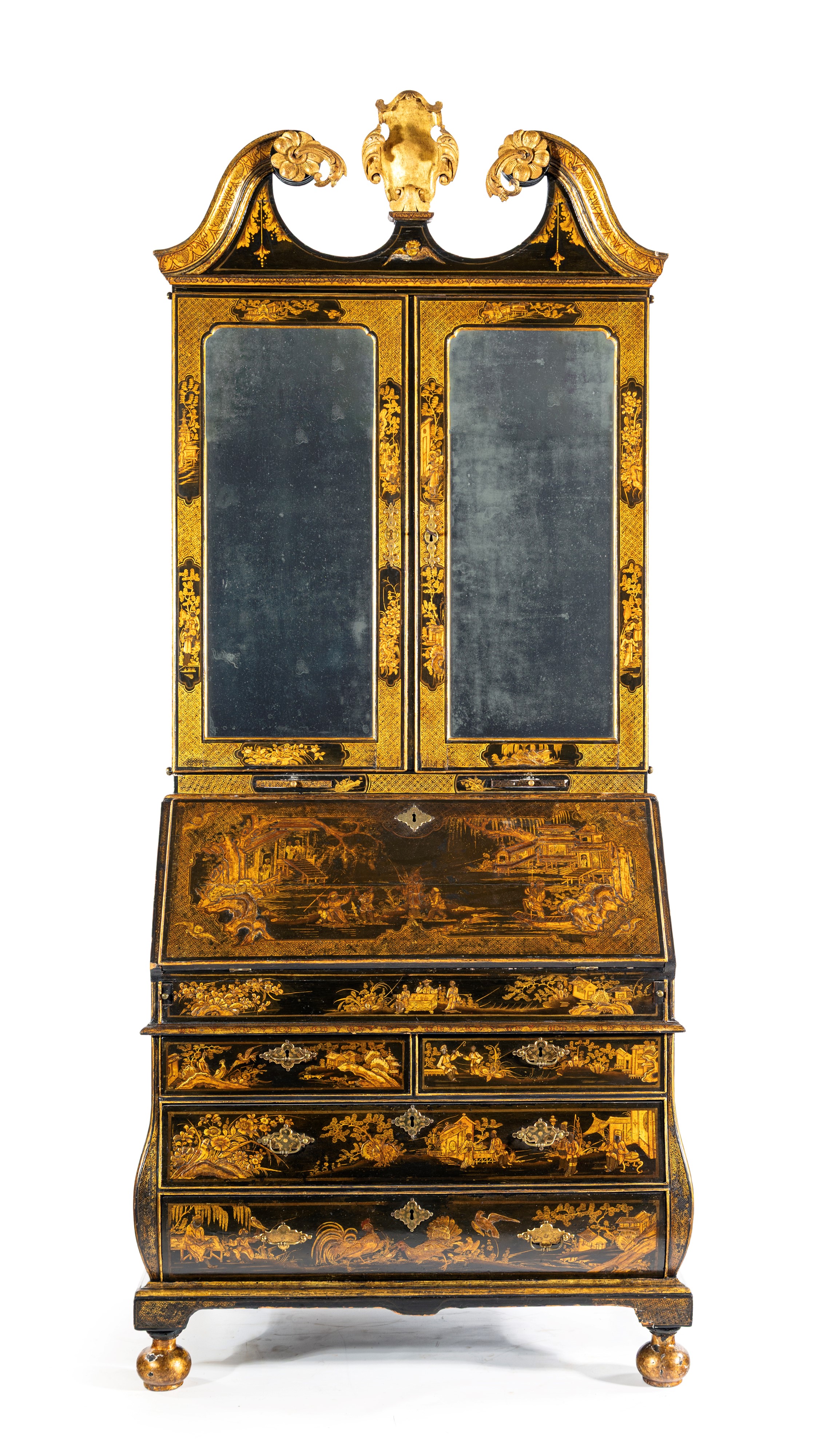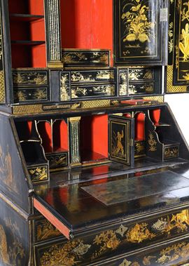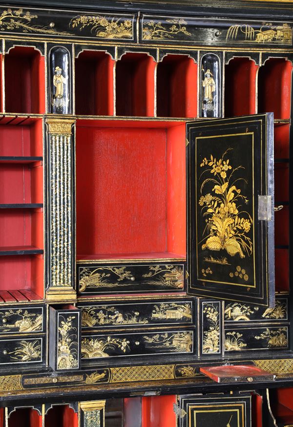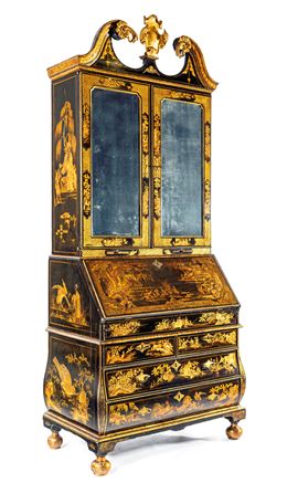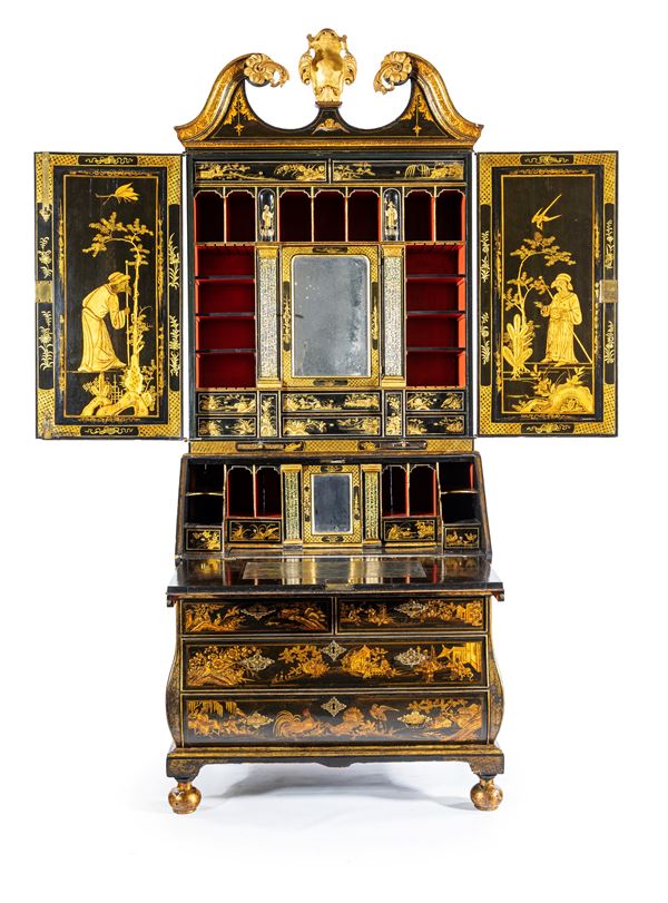 Bureau cabinet in legno laccato nero con chinoiséries dorate, Inghilterra, XVIII secolo