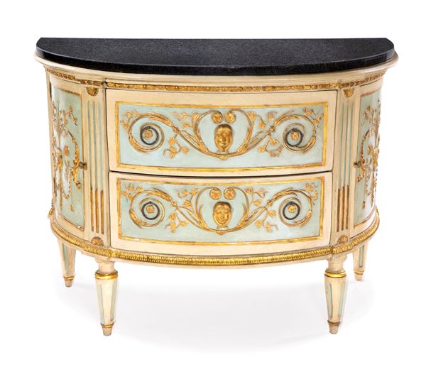 corpo superiore con cimasa a timpano spezzato rifinito da corolle lignee e centrato da un cartiglio a scudo privo di decorazione; le due ante frontali, decorate con grandi figure in abiti orientali immerse in paesaggi con alberi, uccelli e rocce, tipici motivi della cineseria europea, celano uno scarabattolo con anta centrale a specchio, undici scomparti a giorno e otto tiretti. Sotto gli sportelli, due tablettes estraibili con incavi portavaso in lacca rossa, così come le parti interne. La ribalta ospita un articolato interno da scrittoio: piccoli vani, cassetti segreti e colonnine scanalate, con al centro uno sportellino a specchio, elemento frequente nei cabinet di pregio. Nella parte inferiore due cassetti in linea e due sottostanti delimitati da spigoli curvilinei, animati da scene paesaggistiche e figurative con architetture, vegetazione stilizzata e personaggi orientali idealizzati. Piedi a sfera