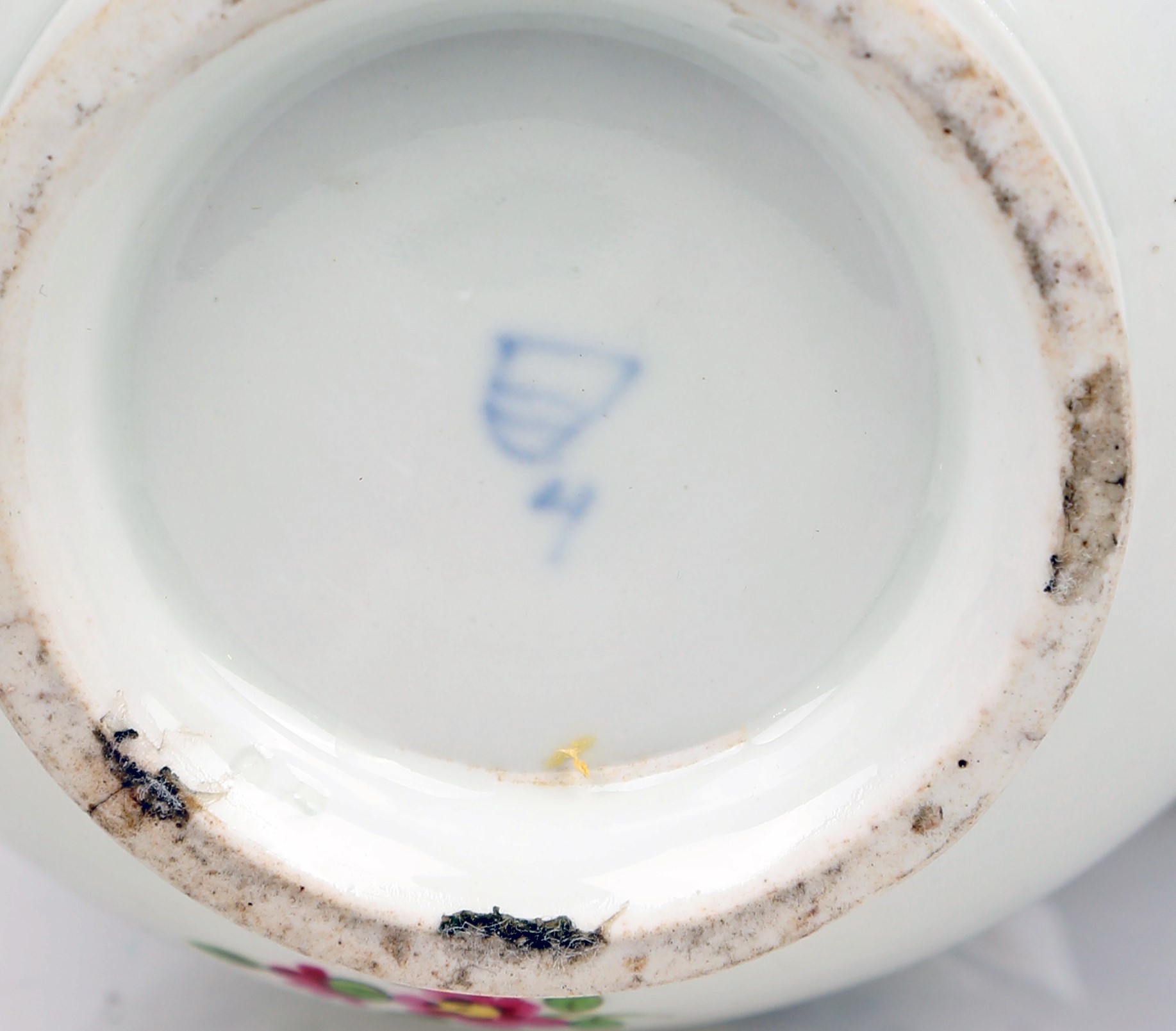decorata con fiori indiani in blu con tocchi di policromia e oro. Marca in blu sottosmalto. Rotture e mancanze