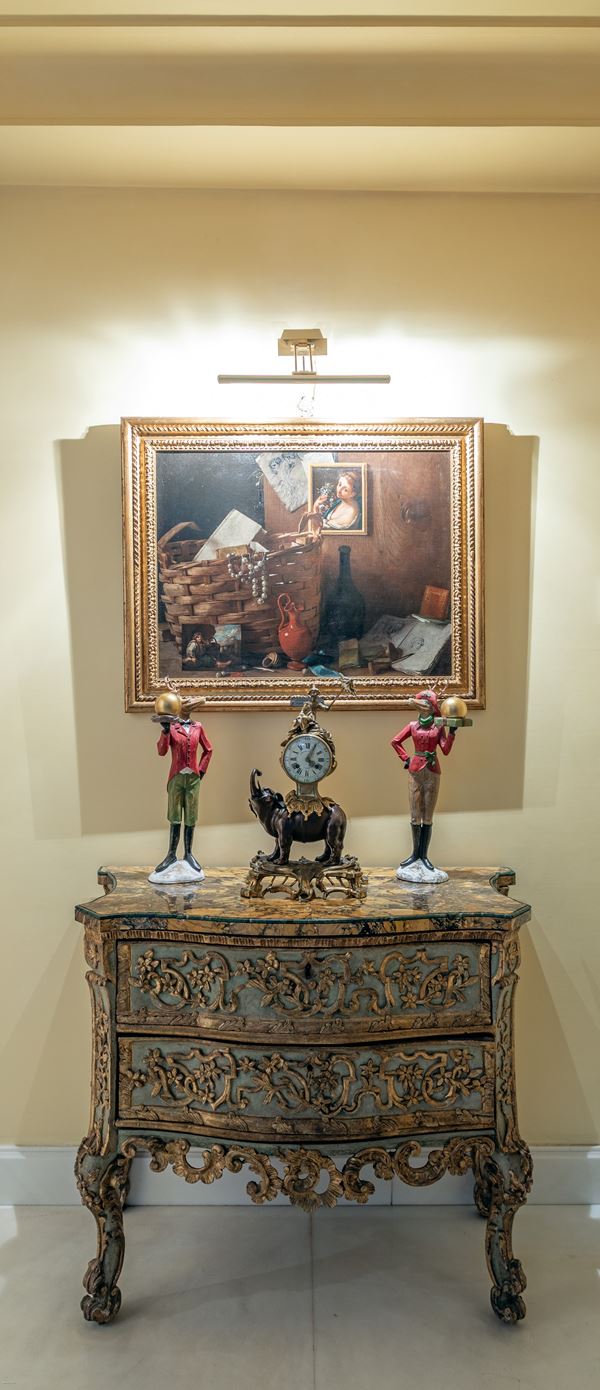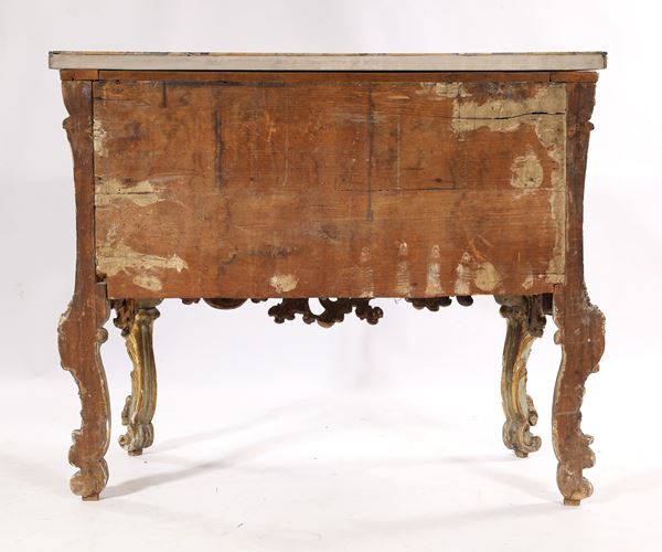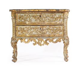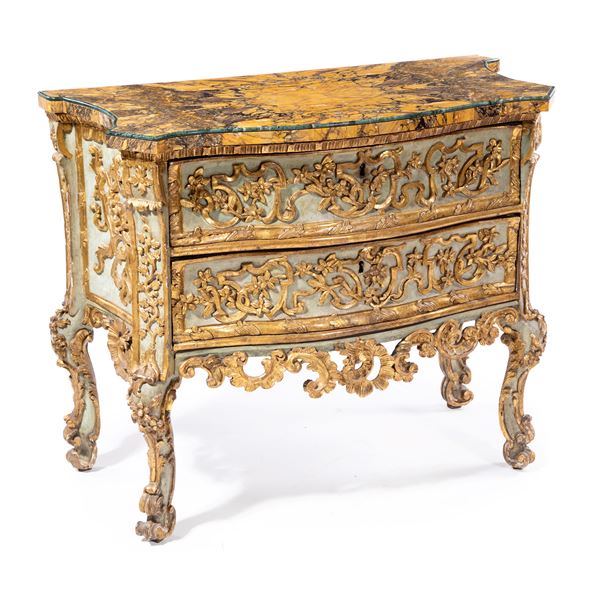 caratterizzato da un corpo di linea sagomata con due cassetti frontali e fianchi concavi delimitati da spigoli scantonati, decorati da un elaborato repertorio di volute, tralci vegetali e motivi floreali intrecciati, scolpiti in rilievo e dorati. Al centro di ciascun cassetto si apre la serratura, integrata armoniosamente nel disegno ornamentale. Anche i fianchi sono riccamente lavorati, con pannelli incorniciati e decorazioni vegetali che dialogano con quelle della facciata, conferendo continuità all’impianto decorativo. Piano sagomato in marmo giallo antico con cordolo verde, corte gambe "cabriole" terminanti a ricciolo.