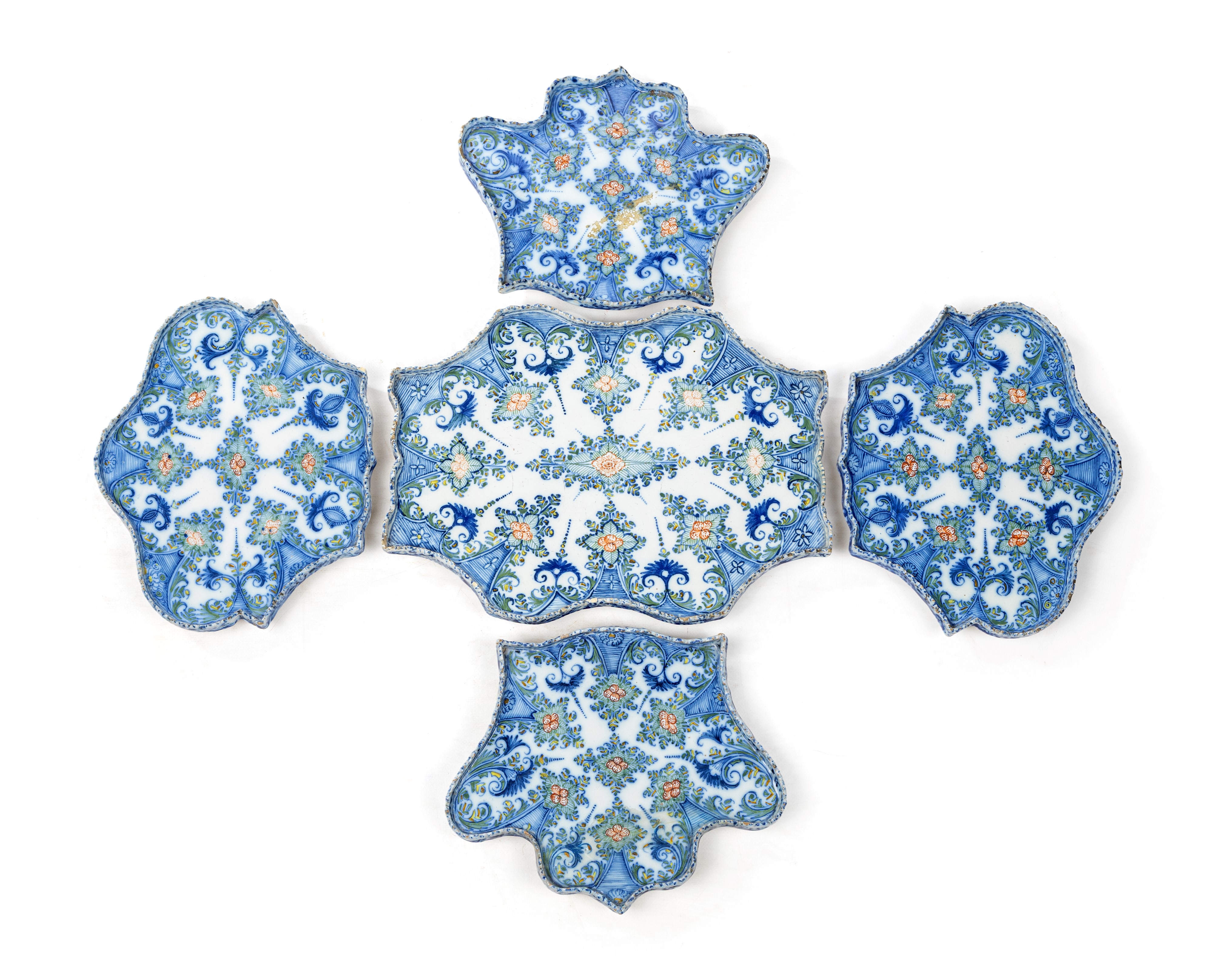 Centrotavola in maiolica composto da cinque elementi sagomati, Lodi o Torino, manifattura Rossetti, prima metà del XVIII secolo