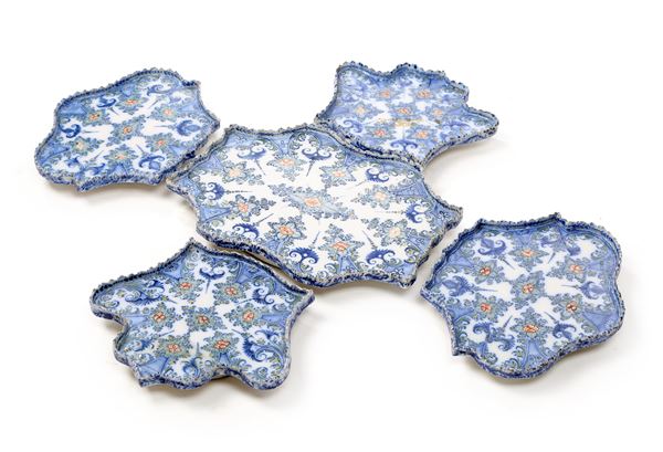 formato da un elemento centrale di maggiori dimensioni e da quattro elementi satelliti sagomati, concepiti per essere disposti simmetricamente sulla tavola. La forma mossa e lobata di ciascun pezzo, con profili ondulati e contorni spezzati, è decorato da composizioni vegetali dipinte in monocromia blu con con piccoli fiori sparsi rossi, racemi e intrecci vegetali che si organizzano in composizioni simmetriche ma leggere, di ispirazione orientaleggiante. Lievi difetti