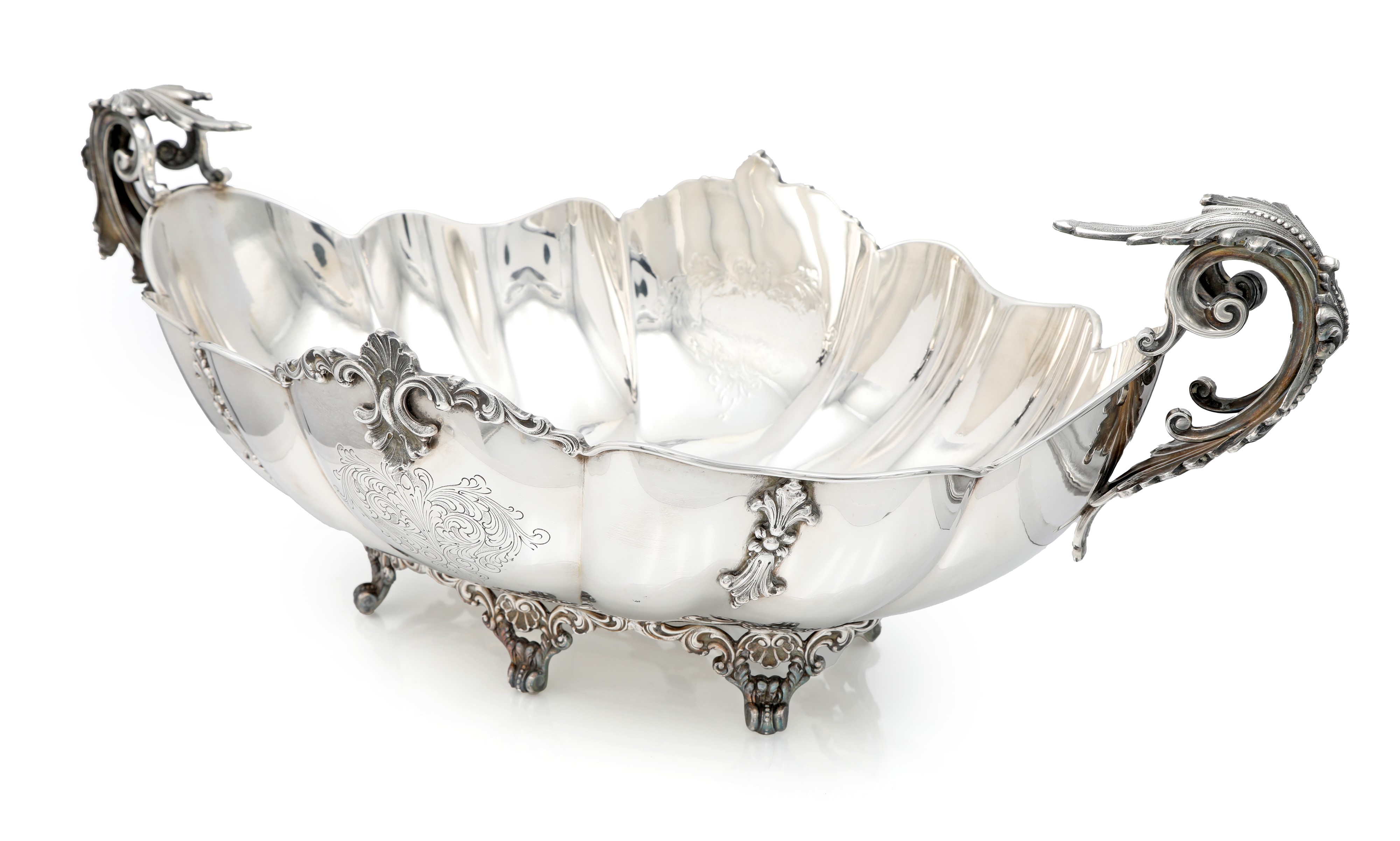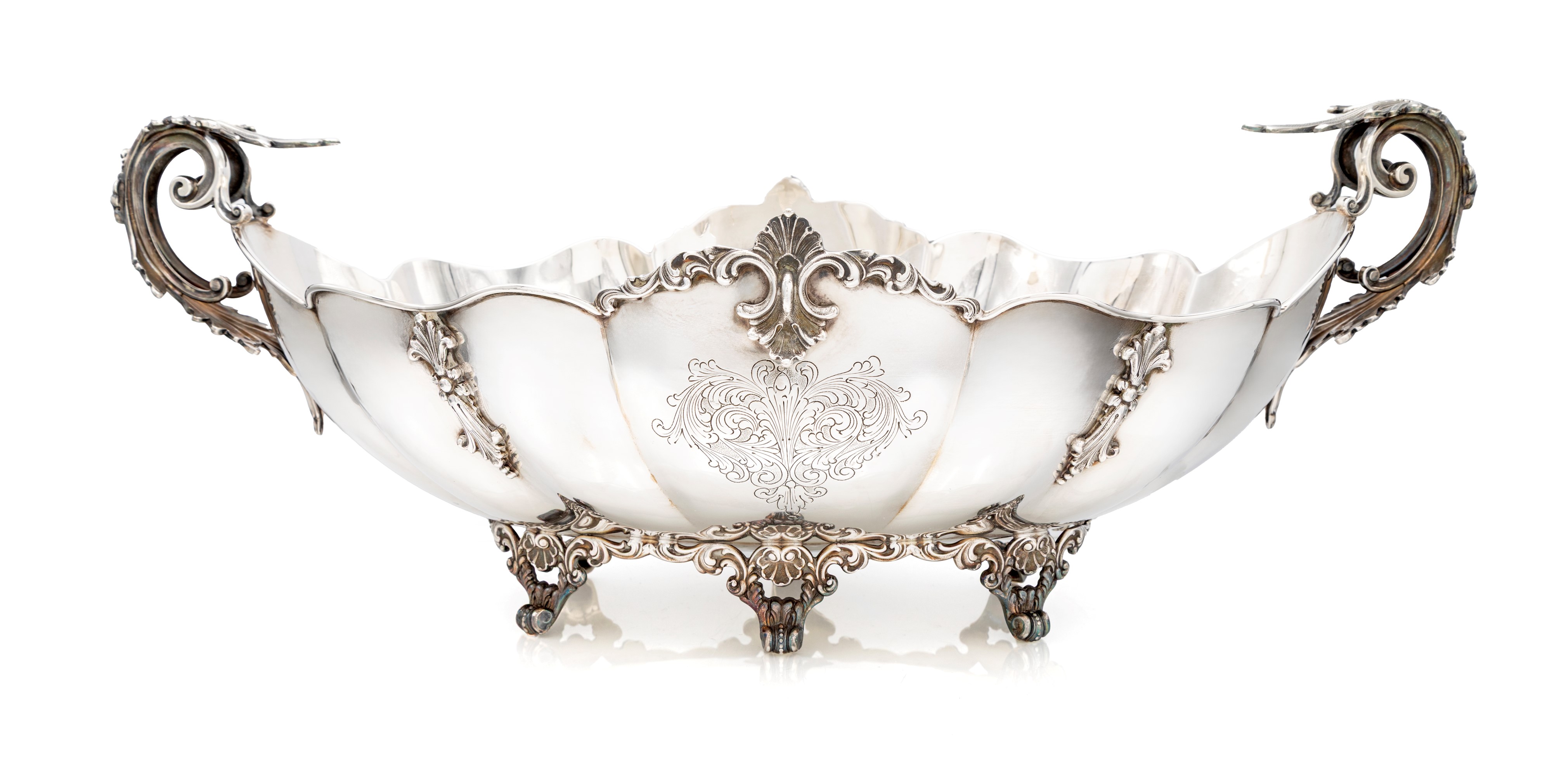 corpo a navicella baccellata con profilo centinato arricchito nella parte mediana da applicazioni vegetali fuse e cesellate; al centro composizione vegetale incisa. Profilo inferiore sottolineato da elementi vegetali disposti in sequenza interrotta da conchiglie su cui si innestano i sostegni. Anse plastiche sagomate terminanti a ricciolo.