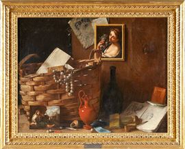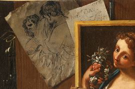 Raffinata natura morta di gusto colto e meditativo, costruita come un articolato assemblaggio di oggetti e immagini allusive. In primo piano una cesta intrecciata accoglie fogli, gioielli e perle, affiancata da libri, disegni, una brocca in terracotta e una bottiglia. Sullo sfondo compaiono riferimenti figurativi di particolare interesse: la riproduzione della celebre Flora di Francesco Mancini, donata dall’artista all’Accademia di San Luca nel 1728 e subito oggetto di ampia fortuna, e un disegno di ispirazione guercinesca, elementi che rimandano al contesto romano e al gusto erudito dell’autore. Appoggiata alla cesta compare inoltre una piccola scena di genere di ascendenza romana, riconducibile all’ambito tra Keil e Antonio Amorosi.
