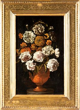 Natura morta floreale raffigurante un bouquet di rose, petunie e begonie in un vaso di terracotta, su fondo scuro. Composizione equilibrata e accurata resa dei dettagli, con raffinato gioco di luci e ombre. Opera riconducibile a Pier Francesco Cittadini, per il sobrio naturalismo dell’impianto, la calibrata impostazione luministica e l’attenzione analitica alla resa dei singoli elementi floreali, condotti con misura e sensibilità tonale tipiche della sua produzione.
