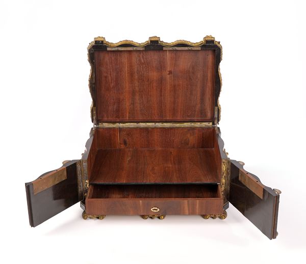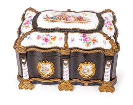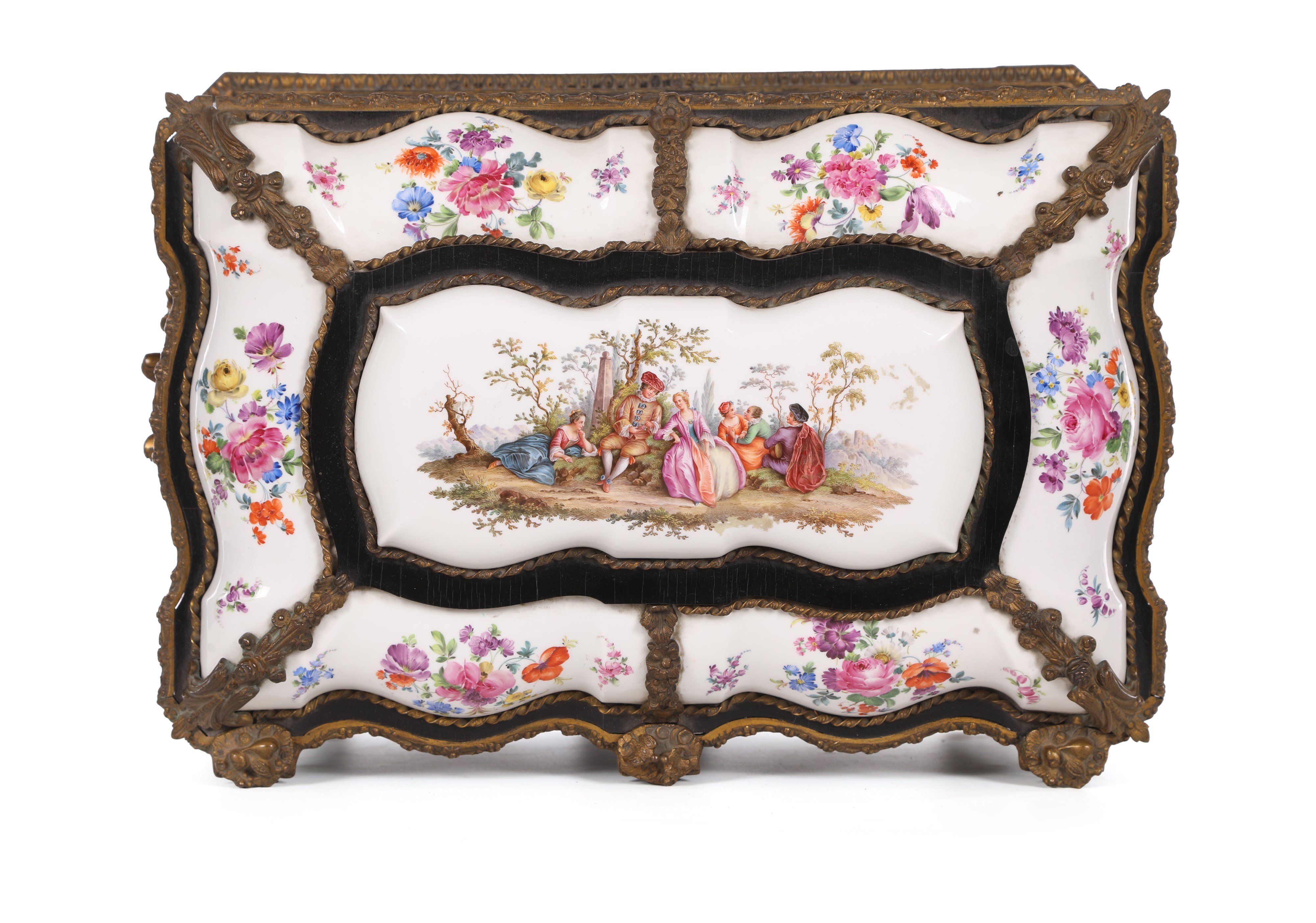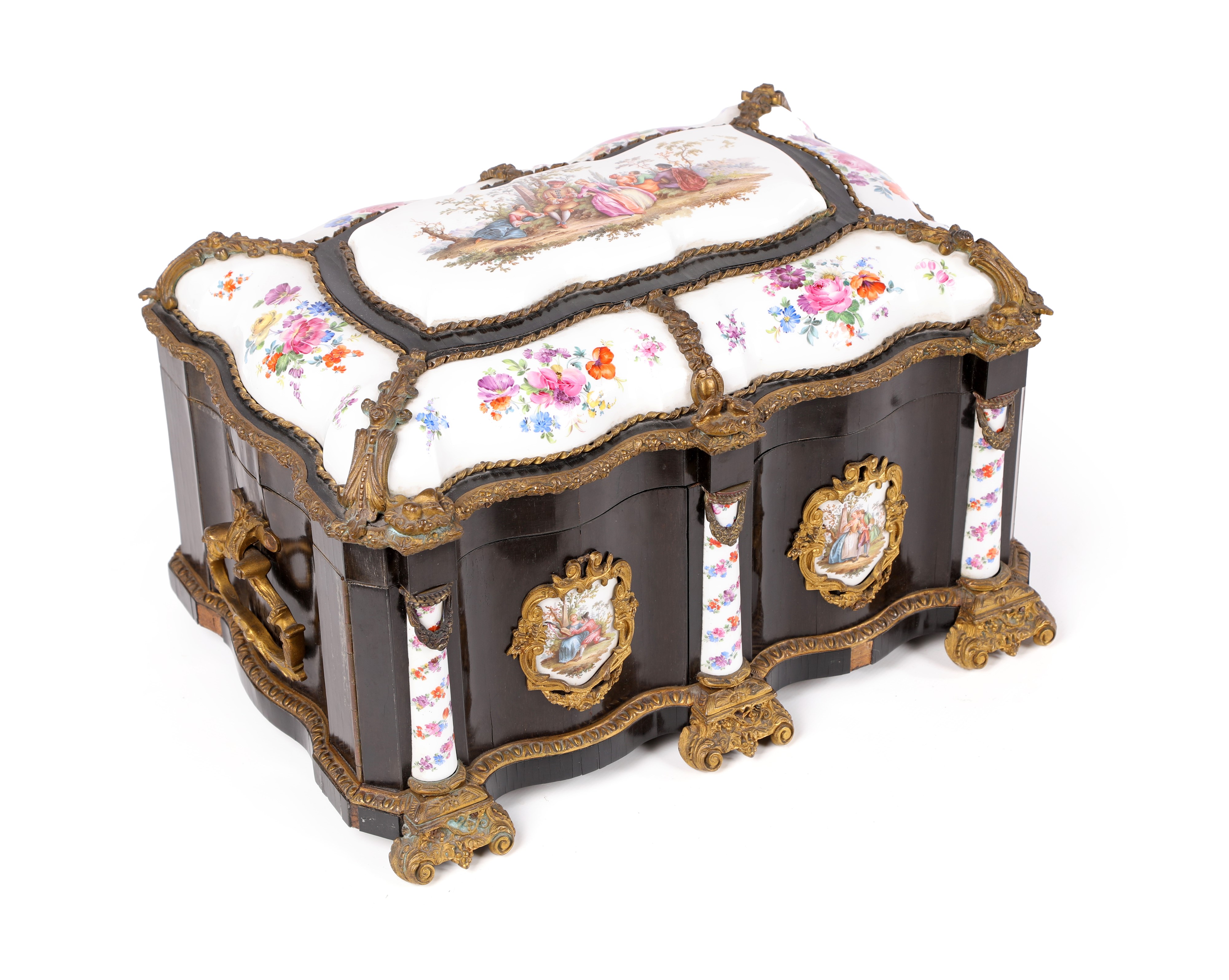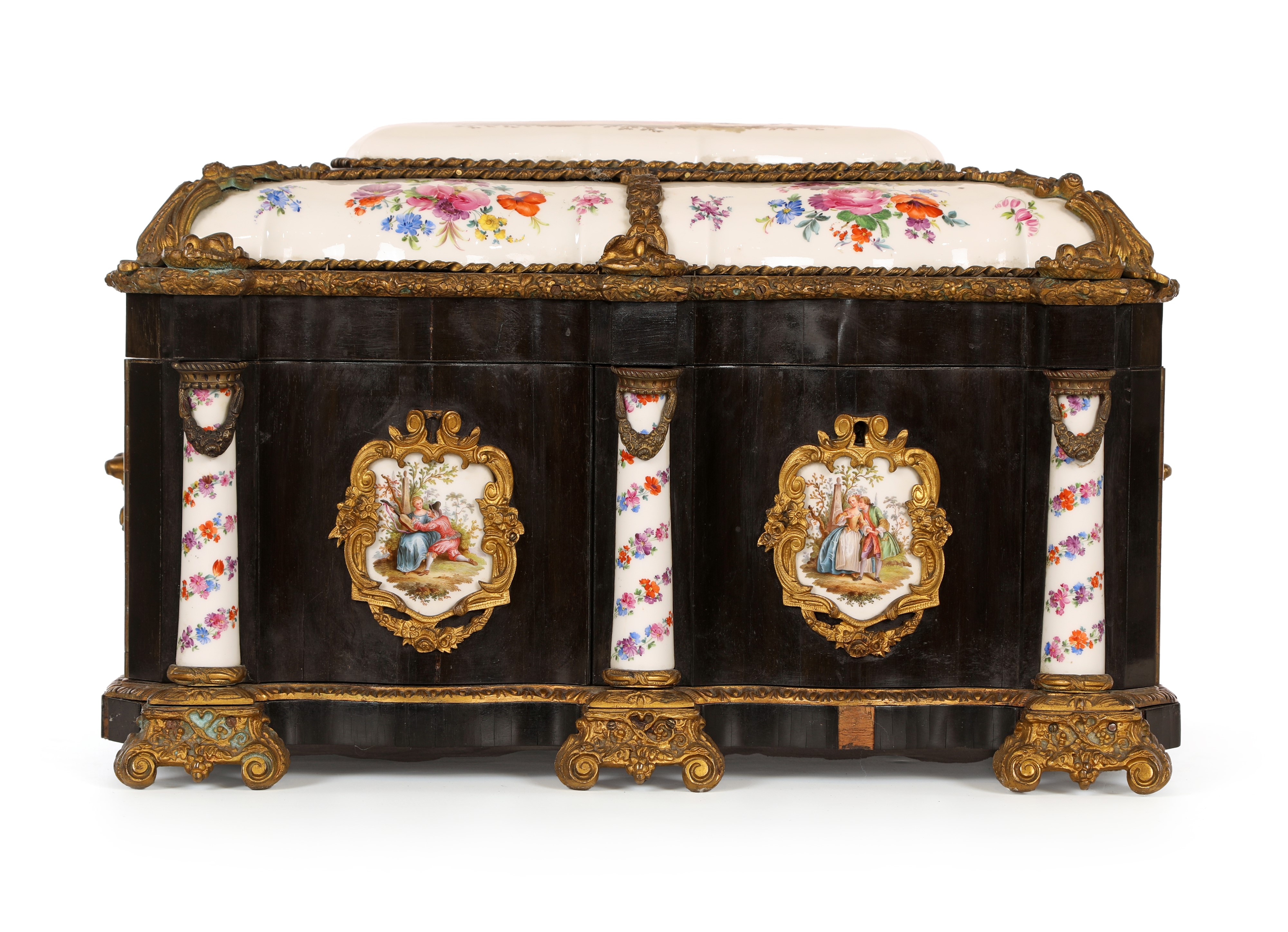 di forma rettangolare sagomata, reca coperchio incernierato decorato da placche in porcellana bianca con decorazione dipinta in vivace policromia, racchiuse da cornici in bronzo dorato; al centro figure in abiti settecenteschi ambientate in un paesaggio alla maniera di Jean-Antoine Watteau; tutt'intorno composizioni di fiori. La facciata, di linea sagomata, è decorata da scudi in porcellana con scene galanti ed è suddivisa in due ante delimitate da lesene semicircolari che celano un cassetto. Maniglie laterali in bronzo dorato, piedi a mensola. Lievi difetti
