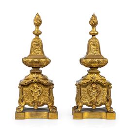Coppia di alari da camino in bronzo dorato, XIX secolo