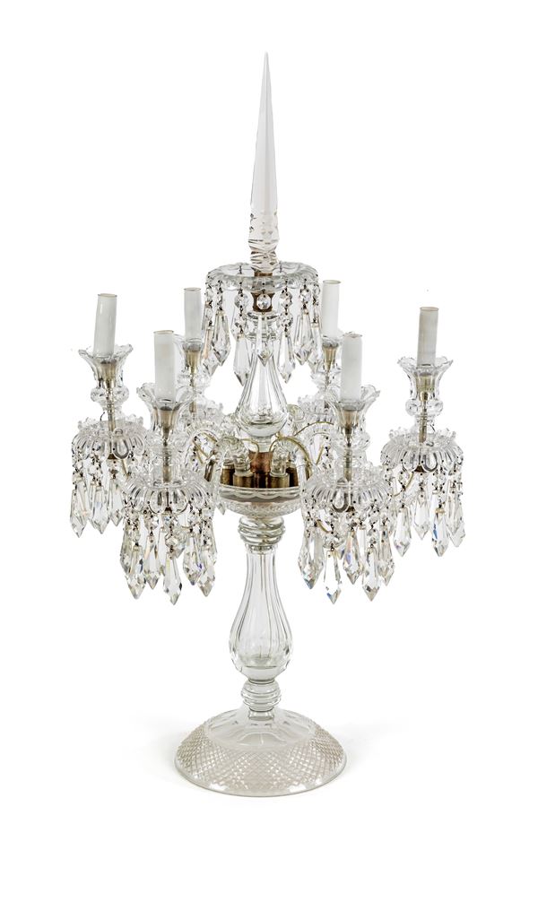 la struttura presenta un fusto centrale scandito da elementi ovoidali in cristallo, culminante in bracci arcuati che sorreggono i portacandele, con bobèches impreziosite da pendenti a goccia in cristallo incolore e ametista. Piede costituito da quattro elementi incurvati terminanti a ricciolo, decorati da rilievi vegetali ed alternati a scudi con gemme color ametista, riuniti fra loro da un anello percorso da sferette incolore sfaccettate