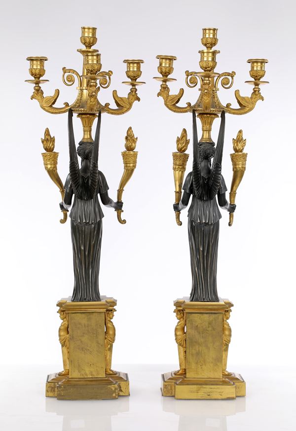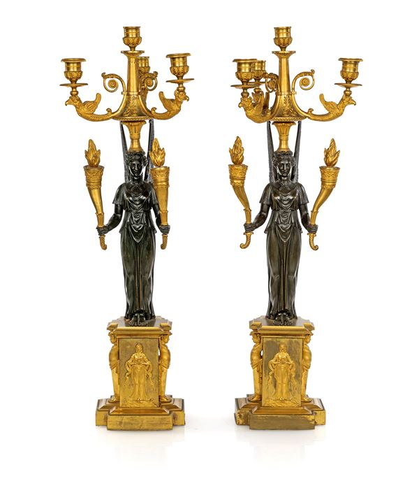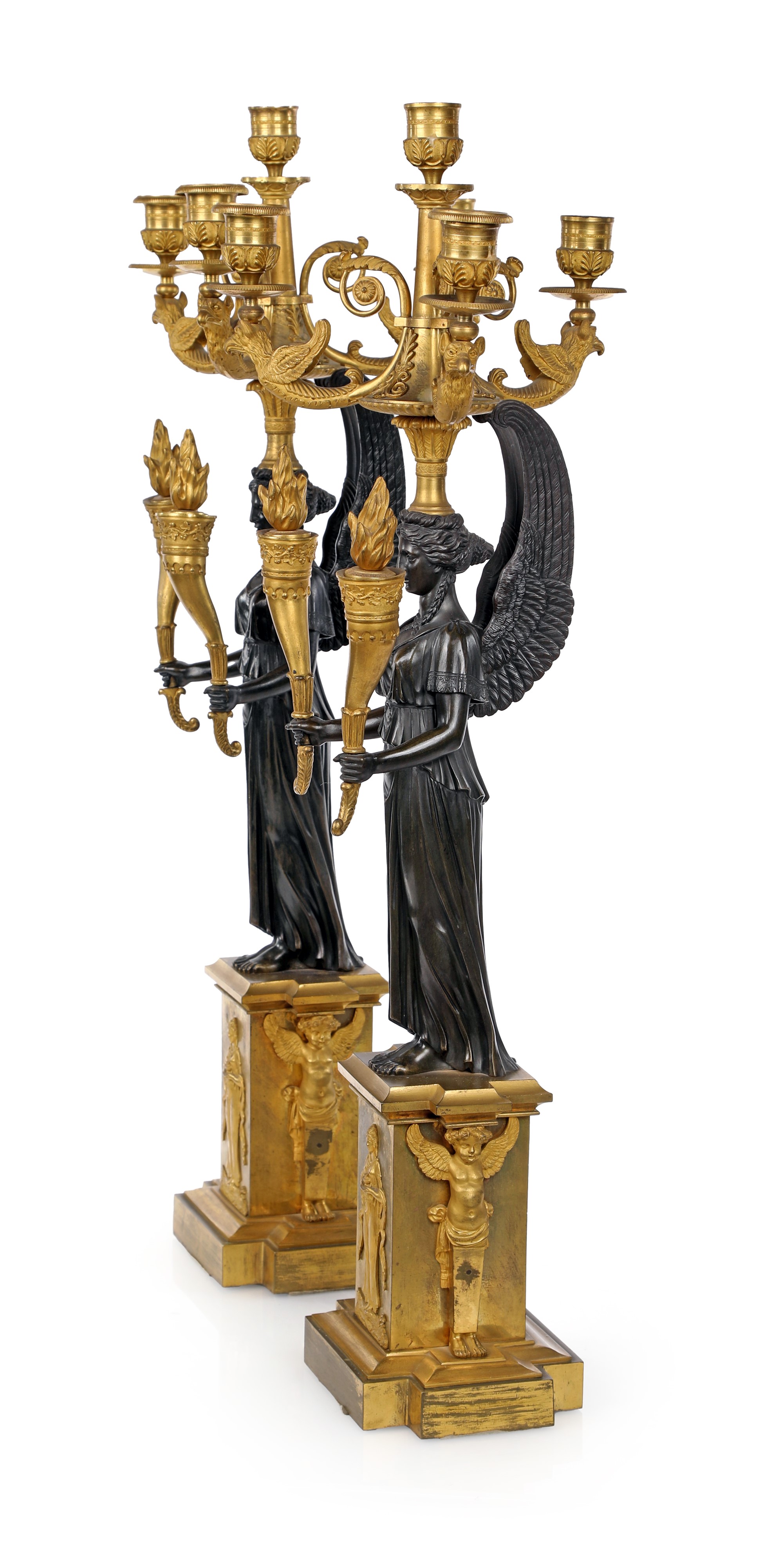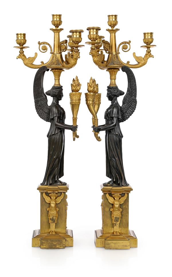 Le figure alate di Vittoria portatrice di fiaccole trasformate in sostegno per candelabro, il repertorio decorativo (aquile, palmette, volute) e per l’impostazione monumentale delle basi, questa coppia di flambeaux si colloca pienamente nei modelli elaborati dalla manifattura di Pierre-Philippe Thomire per il Mobilier Impérial e per le grandi committenze europee del periodo napoleonico.
