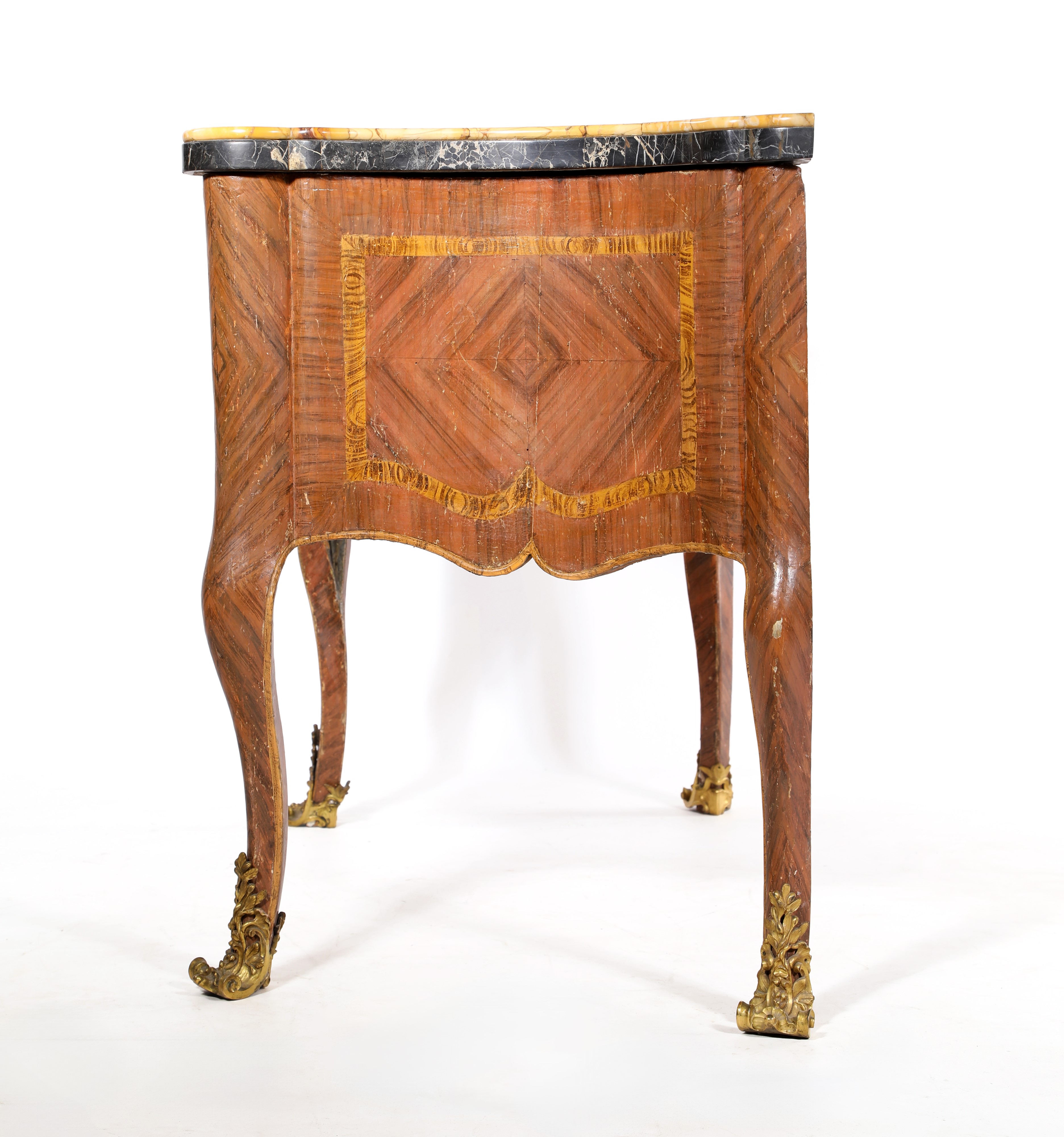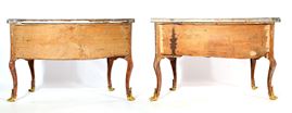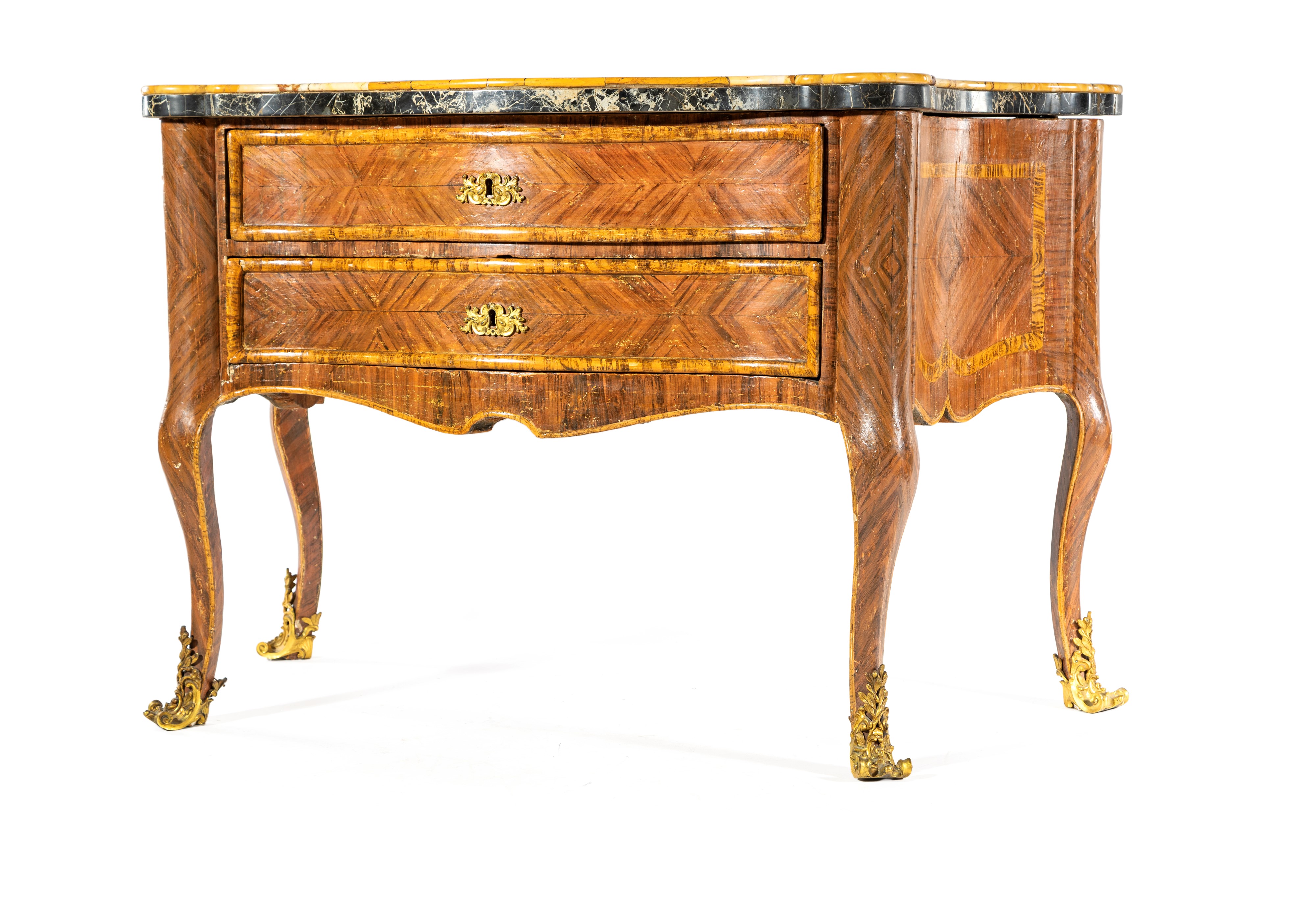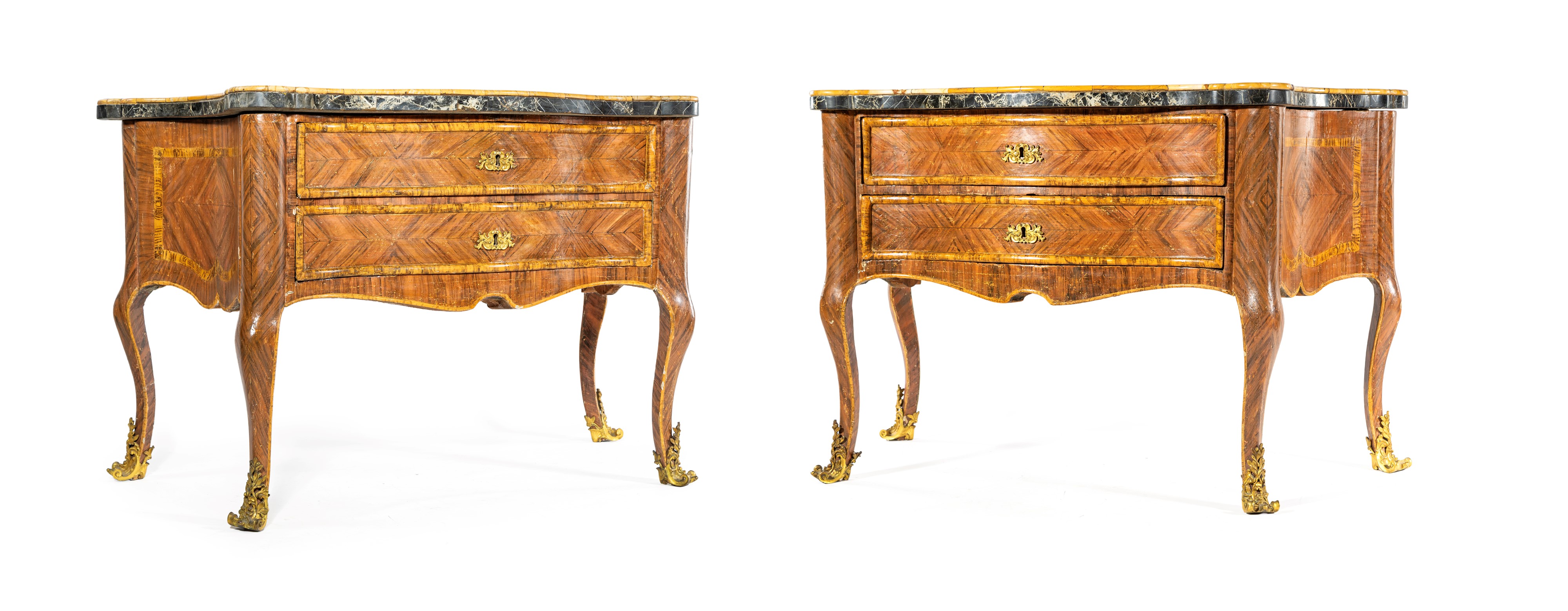 di forma mossa con due cassetti frontali incorniciati da sottili profilature dipinte, sono rifiniti superiormente da piani sagomati in marmo nero d'Aquitania con cordolo giallo; gambe sagomate calzate da scarpette in bronzo cesellato e dorato.
