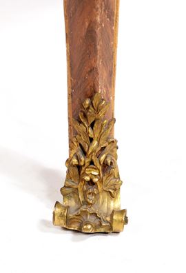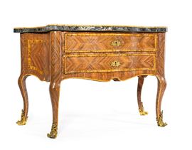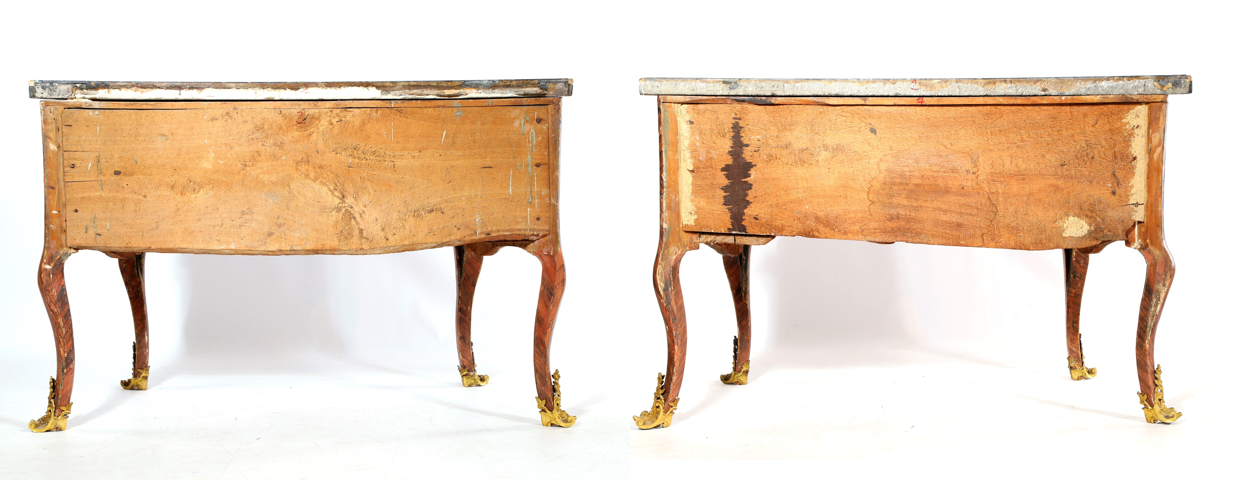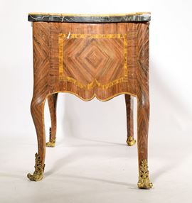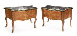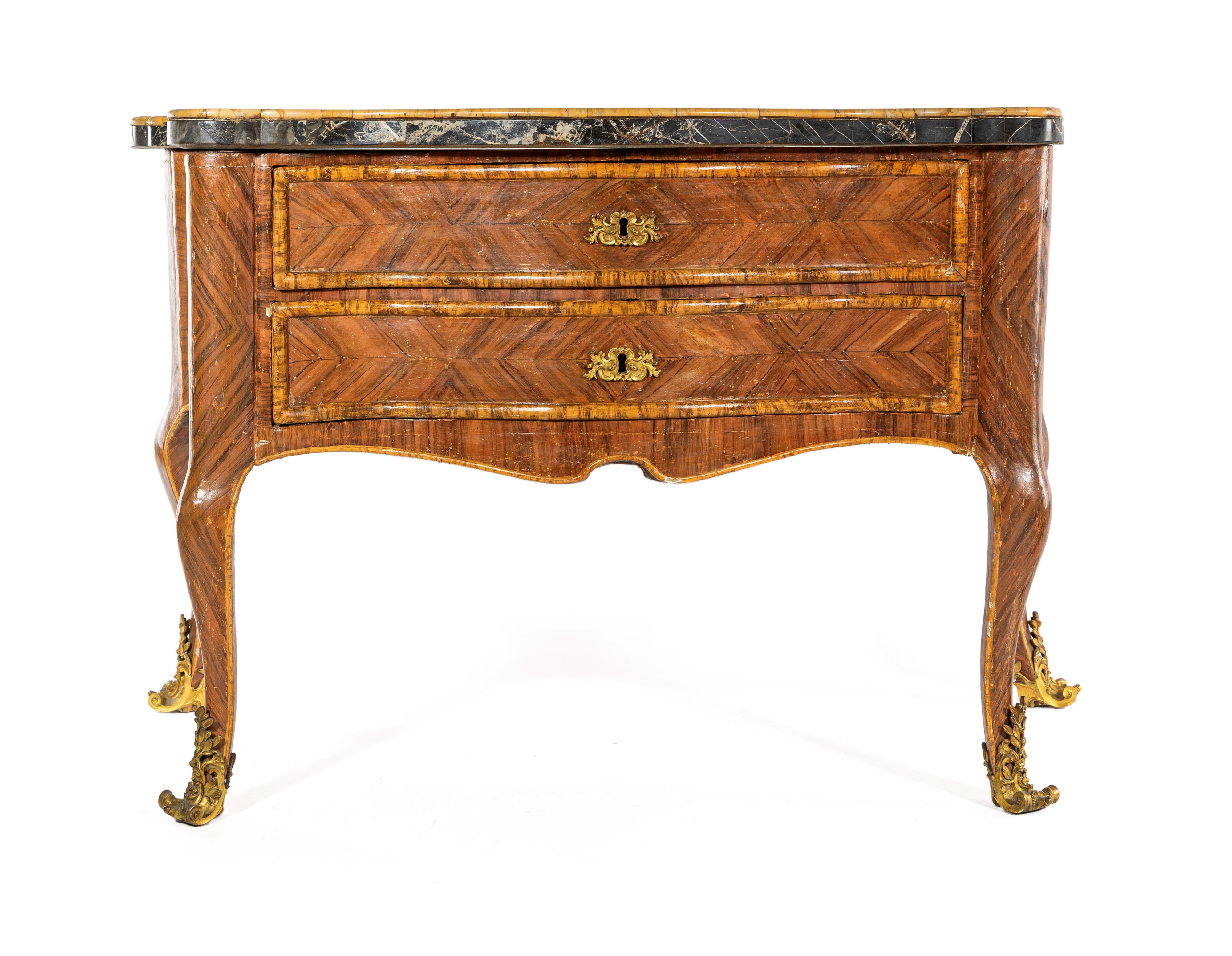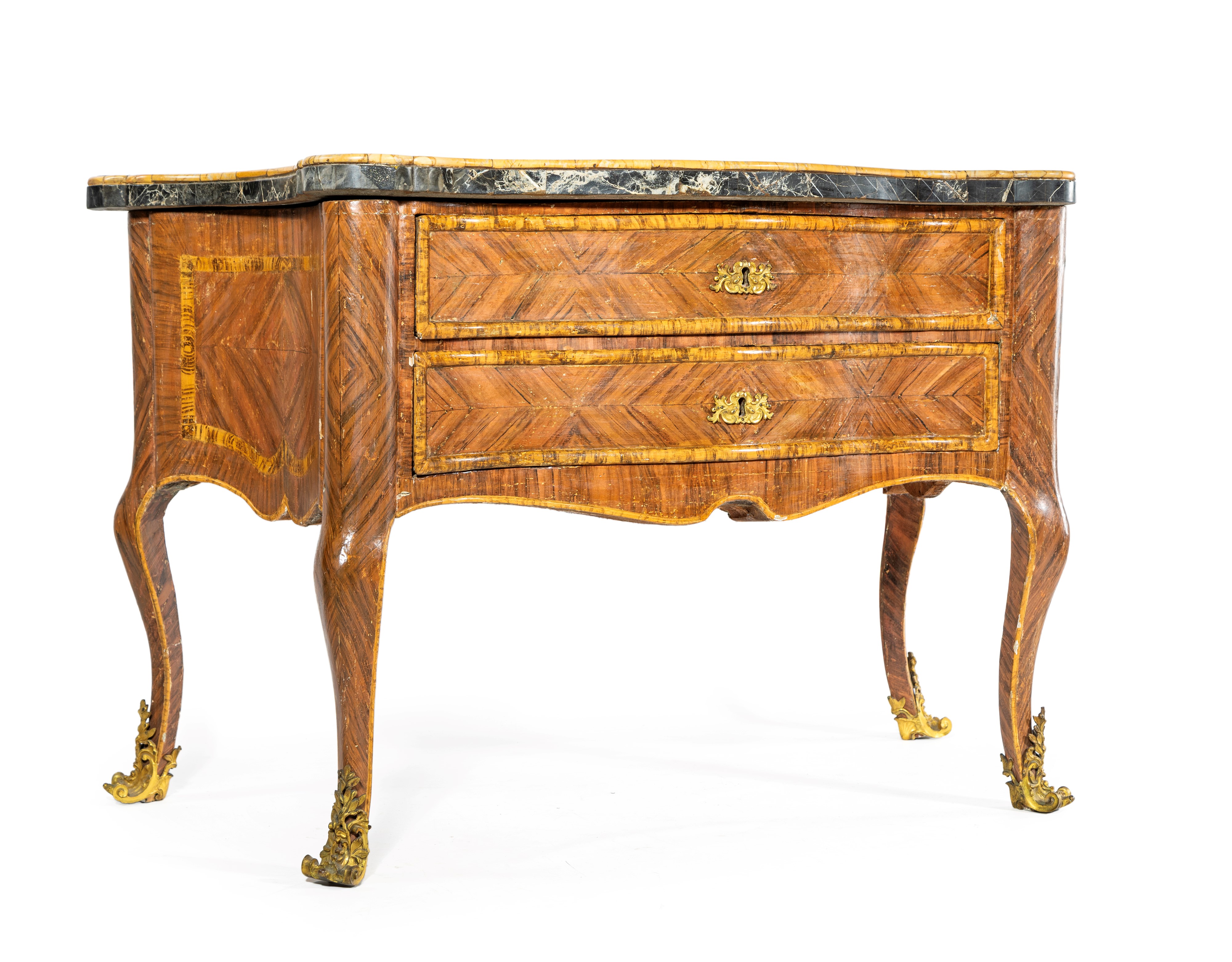 di forma mossa con due cassetti frontali incorniciati da sottili profilature dipinte, sono rifiniti superiormente da piani sagomati in marmo nero d'Aquitania con cordolo giallo; gambe sagomate calzate da scarpette in bronzo cesellato e dorato.