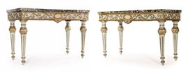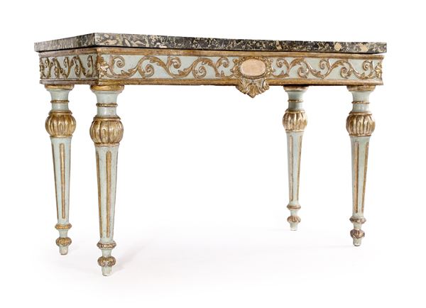 Coppia di consoles in legno laccato azzurro con rilievi decorativi dorati, Marche XVIII secolo
